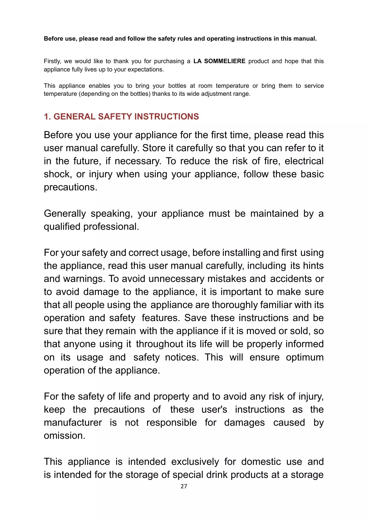 D'une manière générale, votre appareil doit être entretenu par un professionnel qualifié. Pour votre sécurité et pour une utilisation correcte de l’appareil, avant d’installer et d’utiliser l’appareil pour la première fois, lisez attentivement cette notice, y compris les mises en garde et les conseils utiles qu’elle contient. Afin d’éviter d’endommager l’appareil et/ou de vous blesser inutilement, il est important que les personnes amenées à utiliser cet appareil aient pris entièrement connaissance de son fonctionnement ainsi que de ses instructions de sécurité. Conservez ces consignes pour plus tard et pensez à les ranger à côté de l’appareil, afin qu’elles soient transmises avec ce dernier en cas de vente ou de déménagement. Cela permettra de garantir un fonctionnement optimal de l’appareil. Pour éviter tout risque de blessure, conservez cette notice. Le fabricant ne saurait en effet être tenu responsable en cas de mauvaise manipulation de l’appareil. Cet appareil est destiné exclusivement à un usage domestique et est prévu pour le stockage de boissons spéciales à une 1