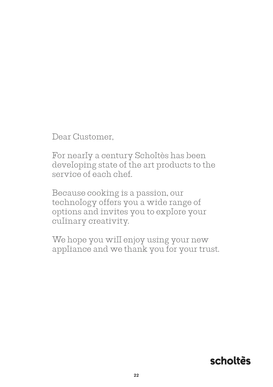 Dear Customer, For nearly a century Scholtès has been developing state of the art products to the service of each chef. Because cooking is a passion, our technology offers you a wide range of options and invites you to explore your culinary creativity. We hope you will enjoy using your new appliance and we thank you for your trust.