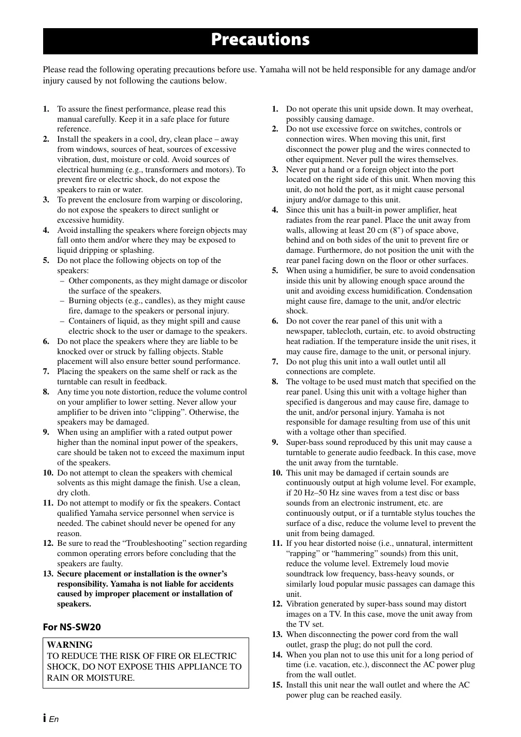 AVERTISSEMENT POUR ÉVITER TOUT RISQUE D’INCENDIE OU D’ÉLECTROCUTION, N’EXPOSEZ PAS CET APPAREIL À LA PLUIE OU À L’HUMIDITÉ. 1. Ne le faites pas fonctionner à l’envers. Il peut surchauffer et être endommagé. 2. Manœuvrez les commutateurs et les commandes avec précaution, veillez aux câbles de liaison. Avant de déplacer cet appareil, débranchez la fiche du cordon d’alimentation et les câbles qui le relient aux autres appareils. Ne tirez pas sur les câbles. 3. N’introduisez jamais votre main ou un objet dans le port situé sur le côté droit de l’appareil. Lorsque vous déplacez l’appareil, veillez à ne pas le saisir par ce port; vous risquez de vous blesser et/ou d’endommager l’appareil. 4. Cet appareil étant doté d’un amplificateur de puissance, il rayonne de la chaleur, à travers son panneau arrière. Placez cet appareil loin des murs et ménagez au moins 20 cm au-dessus, derrière et sur chaque côté pour réduire les risques d’incendie ou d’endommagement. Par ailleurs, ne positionnez pas cet appareil de telle manière que son panneau arrière soit tourné vers le plancher ou en contact avec une paroi. 5. Si vous utilisez un humidificateur, veillez à réduire les risques de condensation à l’intérieur de cet appareil en ménageant suffisamment d’espace libre autour de lui et en réglant l’humidificateur à une valeur convenable. La condensation peut provoquer un incendie, endommager l’appareil et/ou être la cause d’une secousse électrique. 6. Ne couvrez pas le panneau arrière d’un journal, d’une nappe, d’un rideau, etc., ce qui pourrait empêcher la chaleur de s’évacuer. Une augmentation anormale de la température intérieure de l’appareil peut provoquer un incendie, endommager l’appareil ou entraîner des blessures. 7. Ne branchez pas la fiche du cordon d’alimentation sur une prise secteur aussi longtemps que tous les raccordements ne sont pas terminés. 8. La tension à utiliser est indiquée sur le panneau arrière. Alimenter cet appareil sous une tension supérieure à la tension prescrite, peut provoquer un incendie, endommager l’appareil et/ou entraîner des blessures. Yamaha ne saurait être responsable des dommages résultant de l’utilisation d’une tension d’alimentation différente de la tension prescrite. 9. Le son à fréquences très graves produites par cet appareil peut agir sur la platine de lecture et provoquer un bouclage. Dans ce cas, éloignez l’appareil de la platine de lecture. 10. Cet appareil peut être endommagé par la production permanente de certaines fréquences. Par exemple, si un signal sinusoïdal entre 20 Hz et 50 Hz est produit par un disque d’essai ou des sons très graves sont générés par un instrument de musique électronique, etc., ou encore si le saphir de la platine de lecture frotte sur le microsillon, il sera bon de réduire le niveau de sortie pour éviter les dommages.