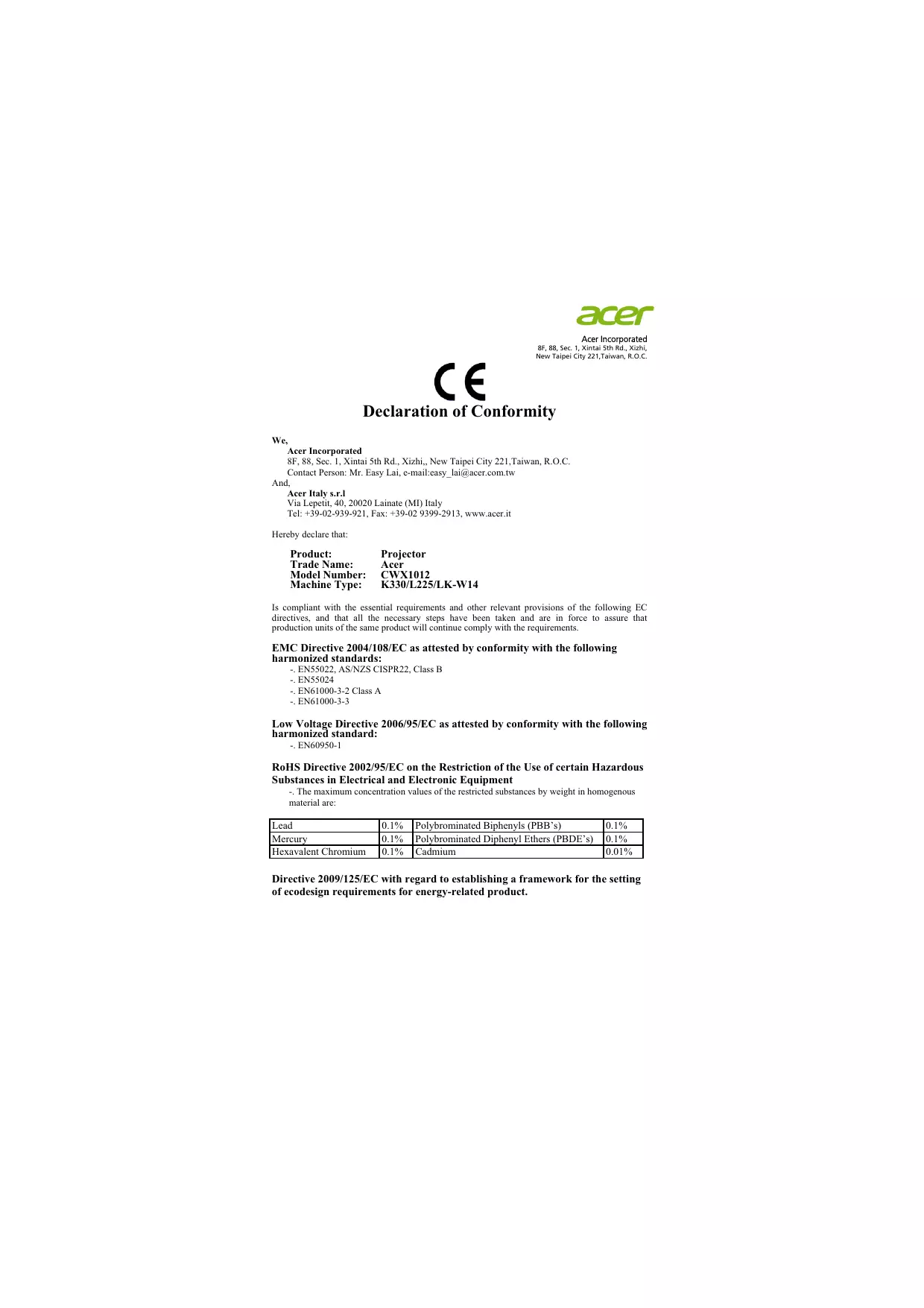 Declaration of Conformity We, Acer Incorporated 8F, 88, Sec. 1, Xintai 5th Rd., Xizhi,, New Taipei City 221,Taiwan, R.O.C. Contact Person: Mr. Easy Lai, e-mail:easy_lai@acer.com.tw And, Acer Italy s.r.l Via Lepetit, 40, 20020 Lainate (MI) Italy Tel: +39-02-939-921, Fax: +39-02 9399-2913, www.acer.it Hereby declare that: