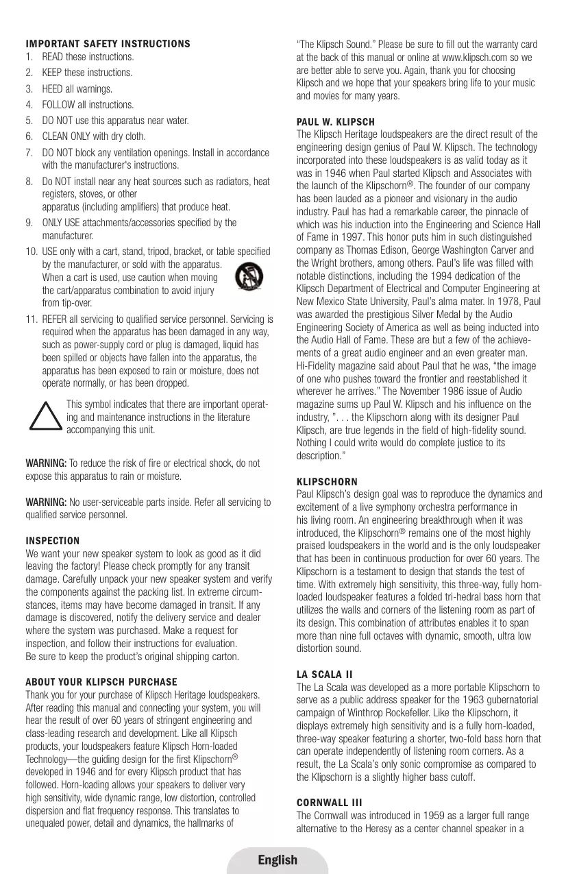 4. SUIVRE toutes les instructions. 5. NE PAS utiliser cet appareil à proximité de l’eau. 6. NETTOYER UNIQUEMENT avec un chiffon sec. 7. NE PAS OBSTRUER les orifices de ventilation. Installer conformément aux instructions du constructeur. 8. NE PAS installer à proximité de sources de chaleur telles que les radiateurs, les grilles de chauffage, les cuisinières et les autres appareils (notamment les amplificateurs) dégageant de la chaleur. 9. UTILISER UNIQUEMENT les accessoires préconisés par le constructeur. 10. UTILISER exclusivement avec un chariot, un support, un trépied, une console ou un bâti recommandé par le fabricant ou vendu avec l’appareil. Lorsqu’un chariot est utilisé, faire preuve de prudence pour déplacer l’ensemble chariot/appareil afin d’éviter un renversement pouvant causer des blessures. 11. CONFIER tout travail de dépannage à un réparateur professionnel compétent. Faire réparer l’appareil en cas de dommages, par exemple : fiche ou cordon d’alimentation endommagé, liquide renversé sur l’appareil ou objet inséré dans l’appareil, appareil exposé à la pluie ou à l’humidité, mauvais fonctionnement ou après une chute. Ce symbole indique d’importantes instructions d’utilisation et d’entretien dans la documentation accompagnant cet appareil. AVERTISSEMENT : Pour réduire les risques d’incendie et d’électrocution, ne pas exposer cet appareil à la pluie ni à l’humidité. AVERTISSEMENT : Cet appareil ne contient pas de pièces pouvant être remplacées par l’utilisateur. Tout travail de dépannage doit être confié à un réparateur professionnel compétent. INSPECTION Vos nouvelles enceintes doivent être aussi belles qu’à leur départ de l’usine. Vérifiez immédiatement qu’elles n’ont pas été endommagées au cours du transport. Déballez soigneusement les enceintes et vérifiez les composants en vous référant à la liste de colisage. Dans certains cas exceptionnels, des éléments peuvent avoir été endommagés au cours du transport. Si des dégâts sont constatés, contactez le transporteur et le revendeur chez lequel le système a été acheté. Faites une demande d’inspection et suivez les instructions d’évaluation. Veillez à conserver le carton d’emballage d’origine du produit. À PROPOS DE VOTRE ACHAT DE PRODUIT KLIPSCH Merci d’avoir acheté ces enceintes Klipsch Heritage. Après avoir lu ce manuel et raccordé le système, vous bénéficierez des résultats de plus de 60 ans d’études techniques rigoureuses et d’un programme supérieur de recherche et développement. Comme tous les produits Klipsch, ces enceintes bénéficient de la technologie pavillonnée Klipsch qui a servi de ligne directrice au premier modèle Klipschorn® mis