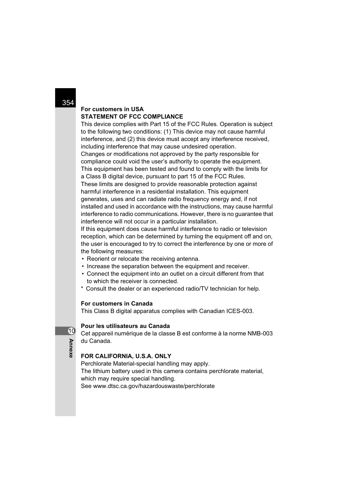 Pour les utilisateurs au Canada Cet appareil numérique de la classe B est conforme à la norme NMB-003 du Canada. FOR CALIFORNIA, U.S.A. ONLY Perchlorate Material-special handling may apply. The lithium battery used in this camera contains perchlorate material, which may require special handling. See www.dtsc.ca.gov/hazardouswaste/perchlorate