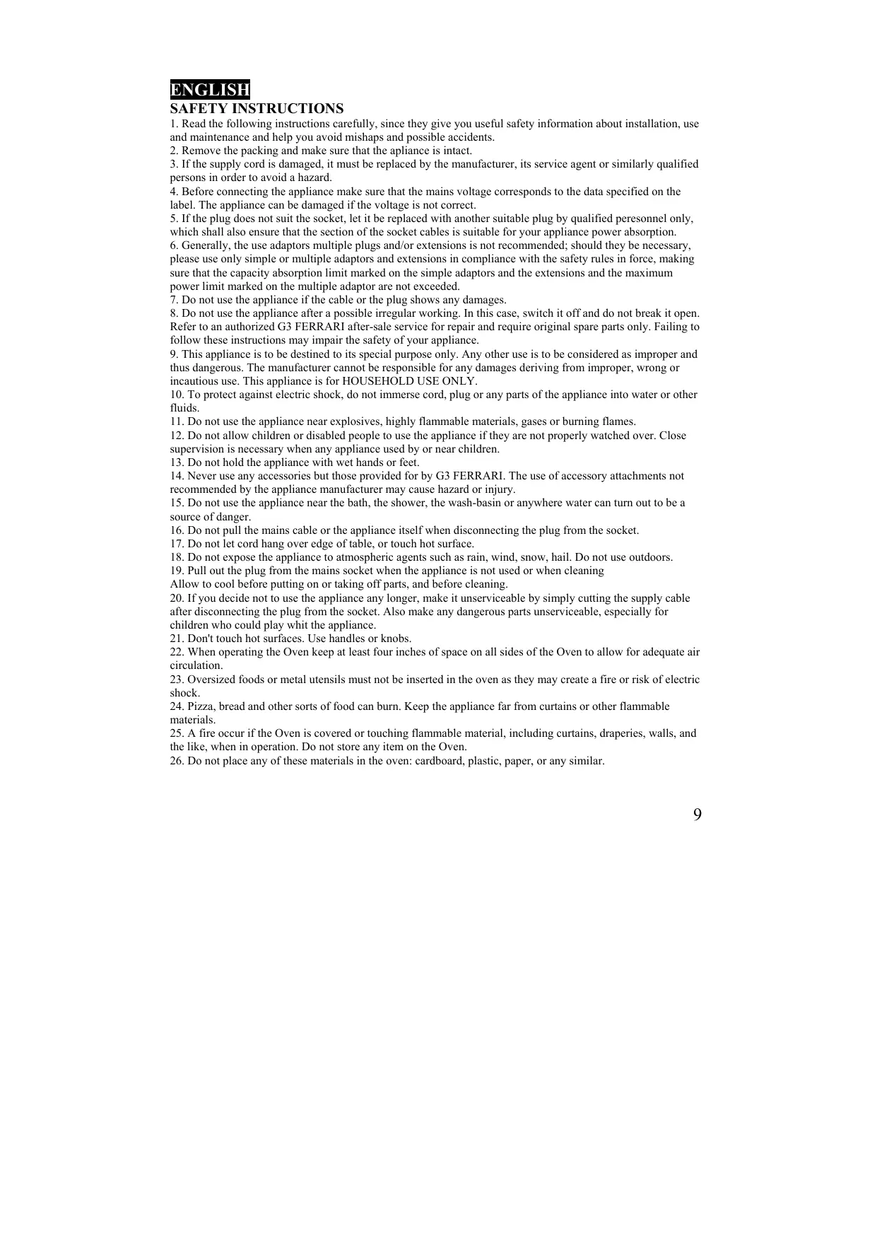16. Ne jamais tirer sur le cordon d'alimentation électrique ou sur l'appareil pour débrancher la fiche de la prise de courant. 17. Ne pas laisser pendre le cordon. 18. Ne jamais exposer l'appareil à d'agents atmosphériques tels que la pluie, le vent, la neige, la grêle. 19. Débrancher toujours l'appareil lorsqu'on ne l'utilise pas et avant son nettoyage. 20. Au cas où on deciderait de ne jamais plus employer cet appareil, il serait vivement recommandé de le rendre complètement inopérant et d'en couper le cordon d'alimentation électrique, après avoir débranché la fiche de la prise de courant. Il est vivement conseillé de rendre inoffensives les parties susceptibles de constituer un danger potentiel, surtout pour les enfants qui pourraient utiliser l'appareil hors d'usage dans leurs jeux. 21. Jamais toucher les surfaces chaudes. Toujours utiliser des gants. 22. Quand on utilise le four laisser au moin 10 centimètres de place tout autour pour favoriser la circulation de l'air. 23. Ne pas introduir des aliments trop grands ou des outils métalliques: il y a le risque d'incendies ou de chocs électriques. 24. La pizza, le pain et les autres aliments peuvent brûler donc l'appareil doit être utilisé loin des rideaux ou des autres matériaux facilement inflammables. 25. Ne poser aucun objet sur le four pendant le fonctionnement. Si le four est couvert ou entre en contact avec matériaux inflammables (rideaux, étoffe, cloisons, ou similaires) pendant le fonctionnement, des flammes peuvent se produire. Le pain et autres aliments peuvent brûler donc, il est conseillé de garder l'appareil loin des rideaux ou des autres matériaux inflammables. 26. Ne pas introduir dans le four matériels type carton, plastique, papier, ou similaires parce qu'ils sont inflammables. 27. Ne pas laisser à l'intérieur de four n'importe quel matériel, une fois éteint, sauf que ses accessoires. 28. L'appareil est éteint seulement quand la fiche est débranché de la prise de courant. 29. Attention! Positionner le four à pizza en manière de faciliter l'ouverture du couvercle à droite ou à gauche. Ne pas l'ouvrir de front, la vapeur est très chaude! Ouvrir le couvercle du four à pizza en manière et avec la même attention qu'on prête en soulevant les couvercles des marmites sur le feu." 30. Porter toujours des gants pour introduir ou enlever des objets du four chaud. 31. Faitez lire ce mode d'emploi aux autres possibles utiliseurs de l'appareil. 32. Gardez ce mode d'emploi.