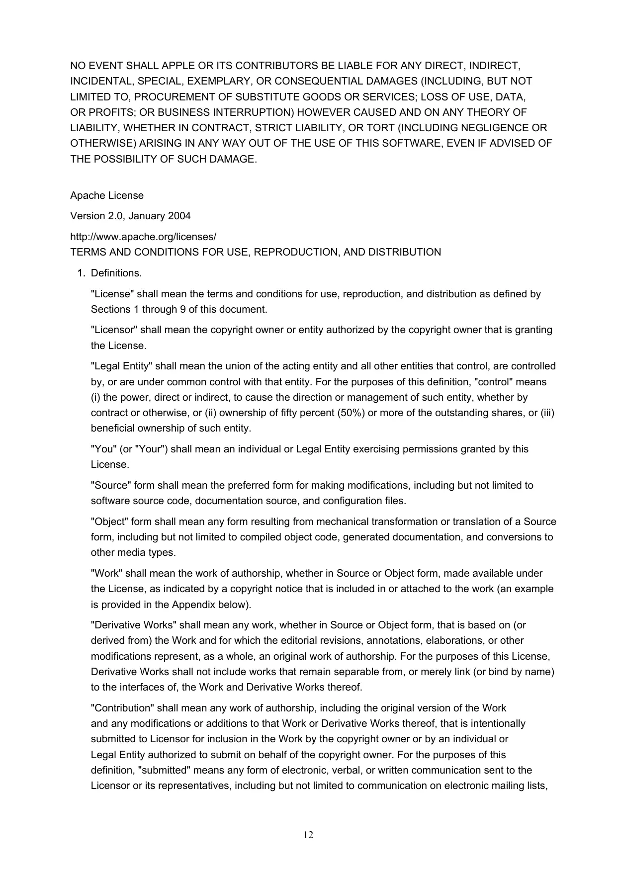 • The name of Fabasoft R&D Software GmbH & Co KG or any of its subsidiaries, brand or product names may not be used to endorse or promote products derived from this software without specific prior written permission. THIS SOFTWARE IS PROVIDED BY THE COPYRIGHT HOLDER ``AS IS'' AND ANY EXPRESS OR IMPLIED WARRANTIES, INCLUDING, BUT NOT LIMITED TO, THE IMPLIED WARRANTIES OF MERCHANTABILITY AND FITNESS FOR A PARTICULAR PURPOSE ARE DISCLAIMED. IN NO EVENT SHALL THE COPYRIGHT HOLDER BE LIABLE FOR ANY DIRECT, INDIRECT, INCIDENTAL, SPECIAL, EXEMPLARY, OR CONSEQUENTIAL DAMAGES (INCLUDING, BUT NOT LIMITED TO, PROCUREMENT OF SUBSTITUTE GOODS OR SERVICES; LOSS OF USE, DATA, OR PROFITS; OR BUSINESS INTERRUPTION) HOWEVER CAUSED AND ON ANY THEORY OF LIABILITY, WHETHER IN CONTRACT, STRICT LIABILITY, OR TORT (INCLUDING NEGLIGENCE OR OTHERWISE) ARISING IN ANY WAY OUT OF THE USE OF THIS SOFTWARE, EVEN IF ADVISED OF THE POSSIBILITY OF SUCH DAMAGE. ---- Part 8: Apple Inc. copyright notice (BSD) ----Copyright (c) 2007 Apple Inc. All rights reserved. Redistribution and use in source and binary forms, with or without modification, are permitted provided that the following conditions are met: