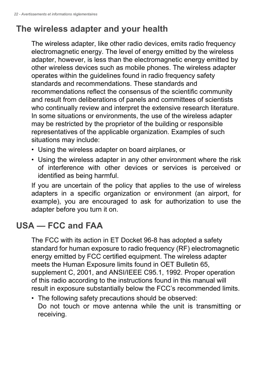 Use on aircraft Avertissement FCC and FAA regulations may prohibit airborne operation of radiofrequency wireless devices (wireless adapters) because their signals could interfere with critical aircraft instruments. Ask the cabin crew before turning on your device’s wireless adapter whilst on board.