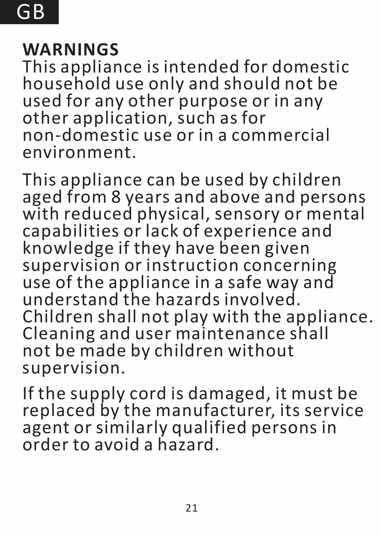 This appliance can be used by children aged from 8 years and above and persons with reduced physical, sensory or mental capabilities or lack of experience and knowledge if they have been given supervision or instruction concerning use of the appliance in a safe way and understand the hazards involved. Children shall not play with the appliance. Cleaning and user maintenance shall not be made by children without supervision.