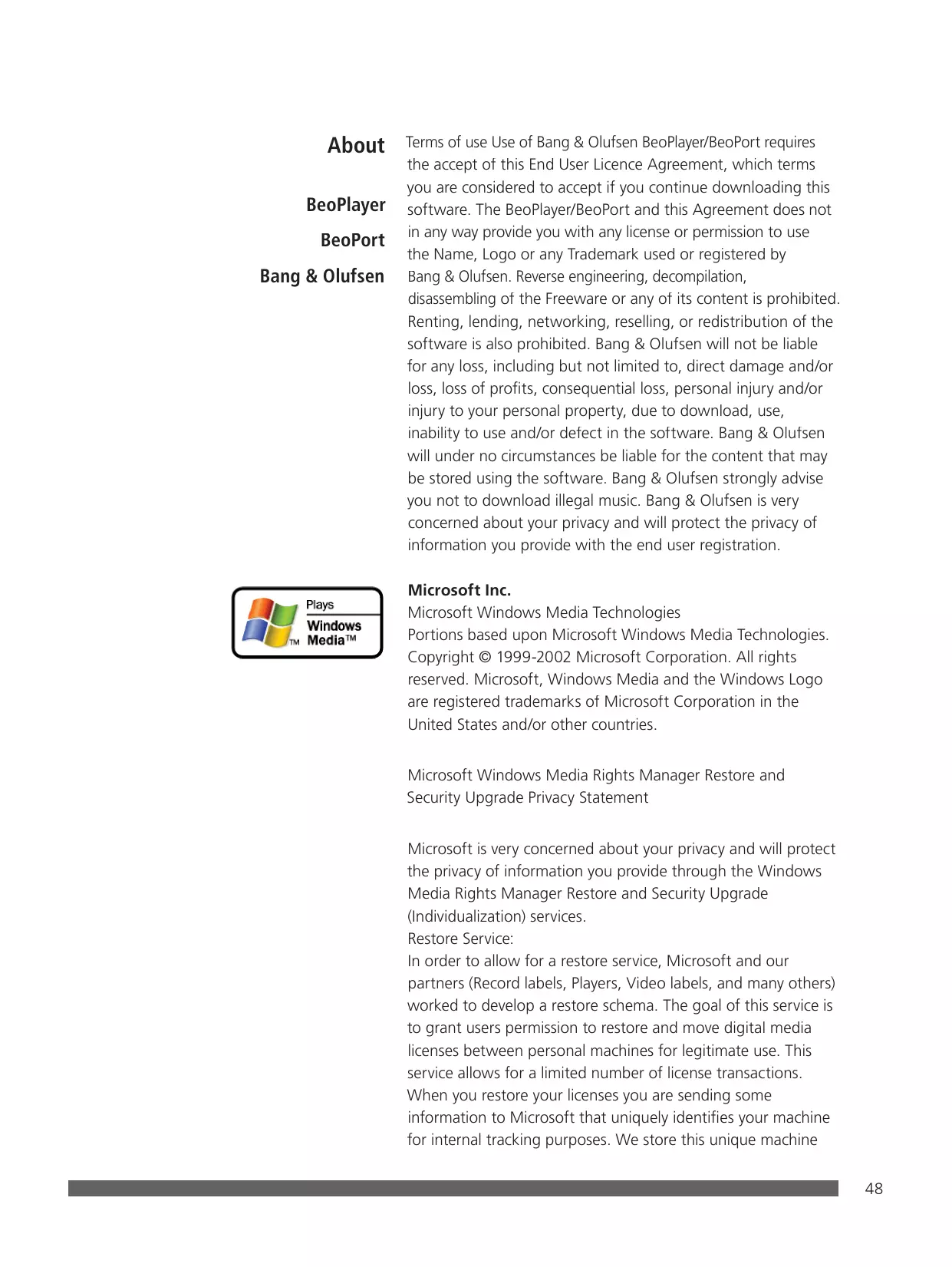 Consignes générales relatives à la manipulation des fichiers protégés par DRM Les seuls fichiers protégés pris en charge par BeoPlayer sont ceux protégés par Microsoft Windows Media DRM. Par conséquent, il est nécessaire de lire votre musique protégée par