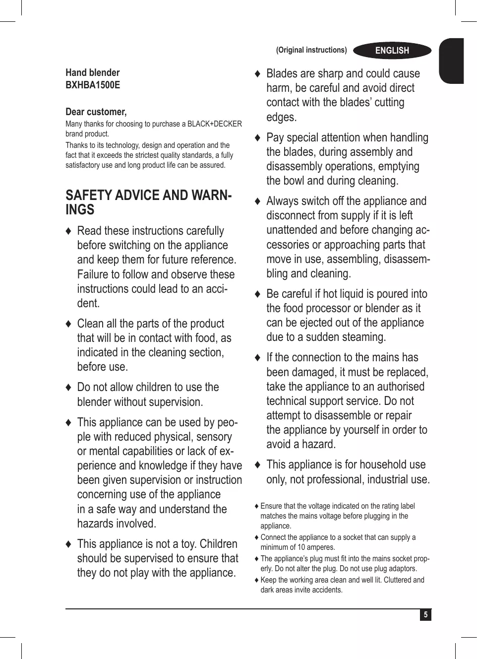 Fig.4 TURBO Fig.5 TURBO Max (Original instructions) Hand blender BXHBA1500E Dear customer, Many thanks for choosing to purchase a BLACK+DECKER brand product. Thanks to its technology, design and operation and the fact that it exceeds the strictest quality standards, a fully satisfactory use and long product life can be assured.