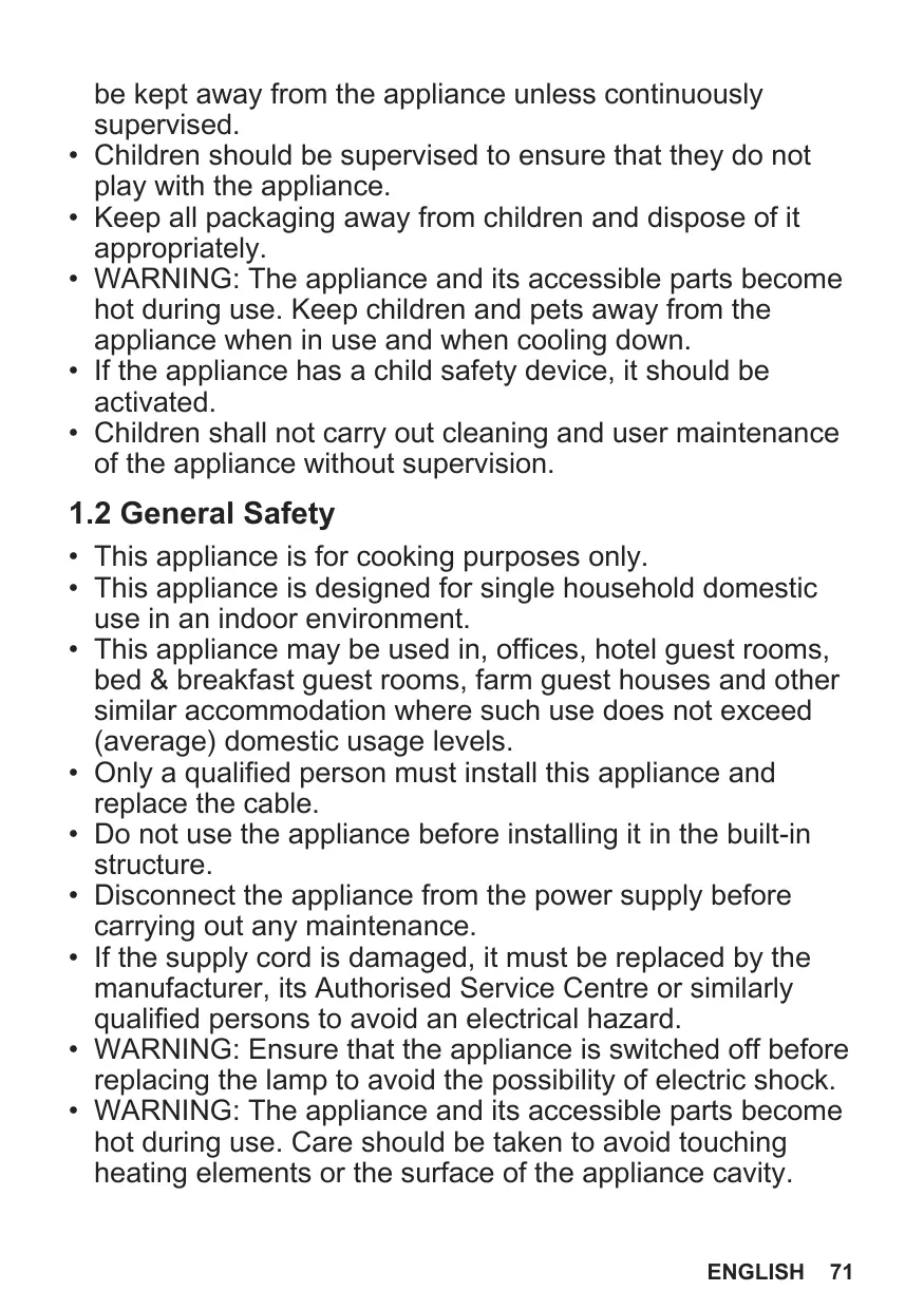 Ne laissez pas les emballages à la portée des enfants et jetez-les convenablement. AVERTISSEMENT : L'appareil et ses parties accessibles deviennent chauds pendant l'utilisation. Tenez les enfants et les animaux éloignés de l’appareil lorsqu’il est en cours d’utilisation et de refroidissement. Si l'appareil est équipé d'un dispositif de sécurité enfants, nous vous recommandons de l'activer. Le nettoyage et l'entretien par l'usager ne doivent pas être effectués par des enfants sans surveillance.
