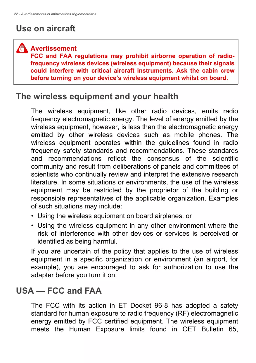 Use on aircraft Avertissement FCC and FAA regulations may prohibit airborne operation of radiofrequency wireless devices (wireless equipment) because their signals could interfere with critical aircraft instruments. Ask the cabin crew before turning on your device’s wireless equipment whilst on board.