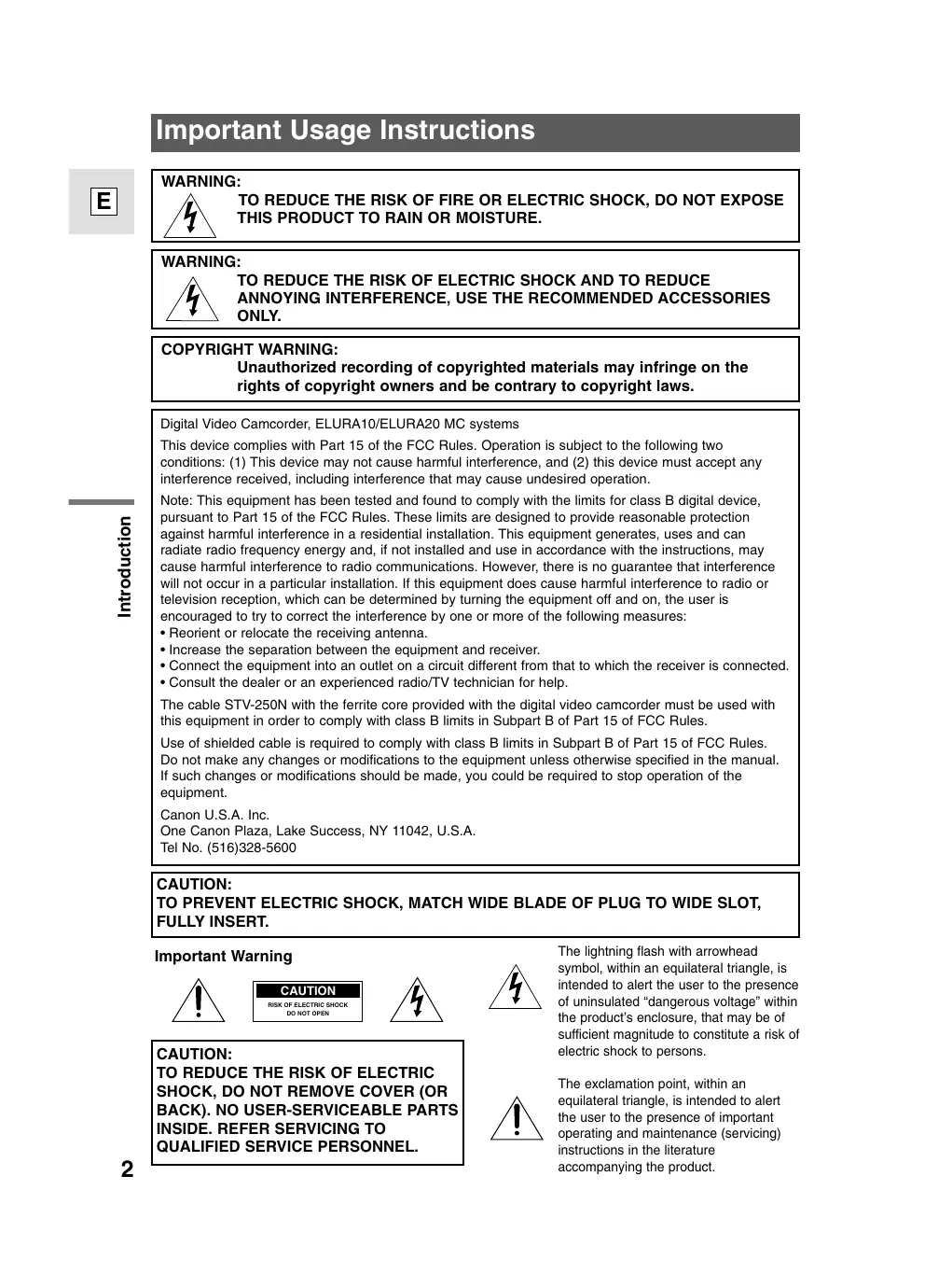 - Consult the dealer or an experienced radio/TV technician for help. The cable STV-250N with the ferrite core provided with the digital video camcorder must be used with this equipment in order to comply with class B limits in Subpart B of Part 15 of FCC Rules. Use of shielded cable is required to comply with class B limits in Subpart B of Part 15 of FCC Rules. Do not make any changes or modifications to the equipment unless otherwise specified in the manual. If such changes or modifications should be made, you could be required to stop operation of the equipment. Canon U.S.A. Inc. One Canon Plaza, Lake Success, NY 11042, U.S.A. Tel No. (516)328-5600 CAUTION: TO PREVENT ELECTRIC SHOCK, MATCH WIDE BLADE OF PLUG TO WIDE SLOT, FULLY INSERT. Important Warning CAUTION