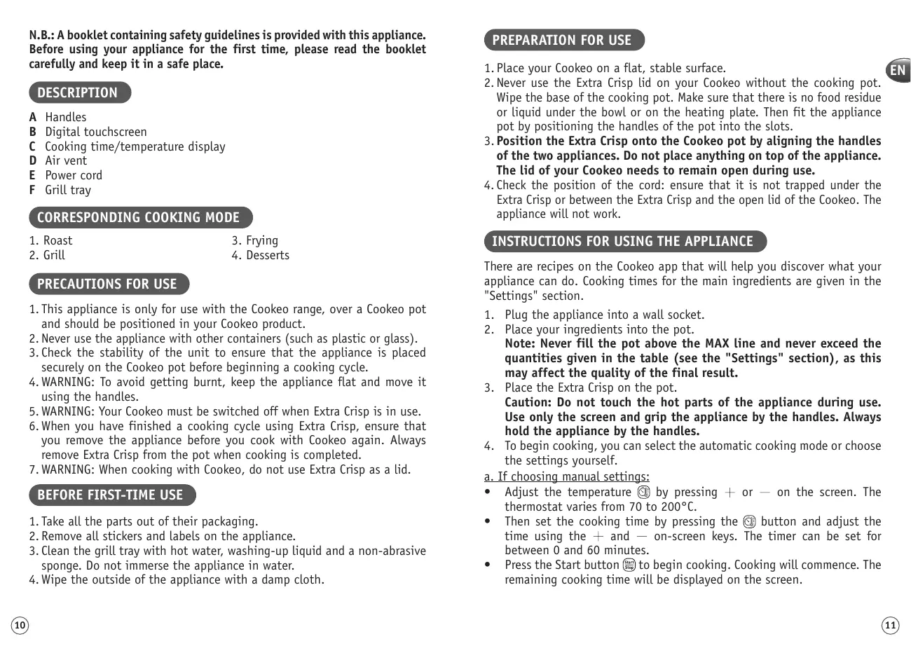 2. Never use the Extra Crisp lid on your Cookeo without the cooking pot. Wipe the base of the cooking pot. Make sure that there is no food residue or liquid under the bowl or on the heating plate. Then fit the appliance pot by positioning the handles of the pot into the slots. 3. Position the Extra Crisp onto the Cookeo pot by aligning the handles of the two appliances. Do not place anything on top of the appliance. The lid of your Cookeo needs to remain open during use. «Ajustes»), ya que podría afectar a la calidad del resultado final. 3. Coloca el Extra Crisp sobre la cubeta. Atención: No toques las partes calientes del aparato mientras esté en marcha. Evita cualquier otro tipo de contacto que no sea utilizar la pantalla o agarrar los tiradores. Coge siempre el aparato por los tiradores. 4. Para iniciar la cocción puedes seleccionar un modo de cocción automática o configurar el aparato manualmente. a. Si optas por una configuración manual: • Configura la temperatura mediante los botones y de la pantalla digital. El termostato admite temperaturas entre los 70 y los 200°C. • Luego selecciona el tiempo de cocción deseado mediante el control táctil y los botones y de la pantalla digital. El temporizador admite periodos de entre 0 y 60 minutos. • Pulsa el botón de puesta en marcha para iniciar la cocción. Una vez hecho esto, la cocción dará comienzo. El tiempo de cocción restante se mostrará en la pantalla. 23