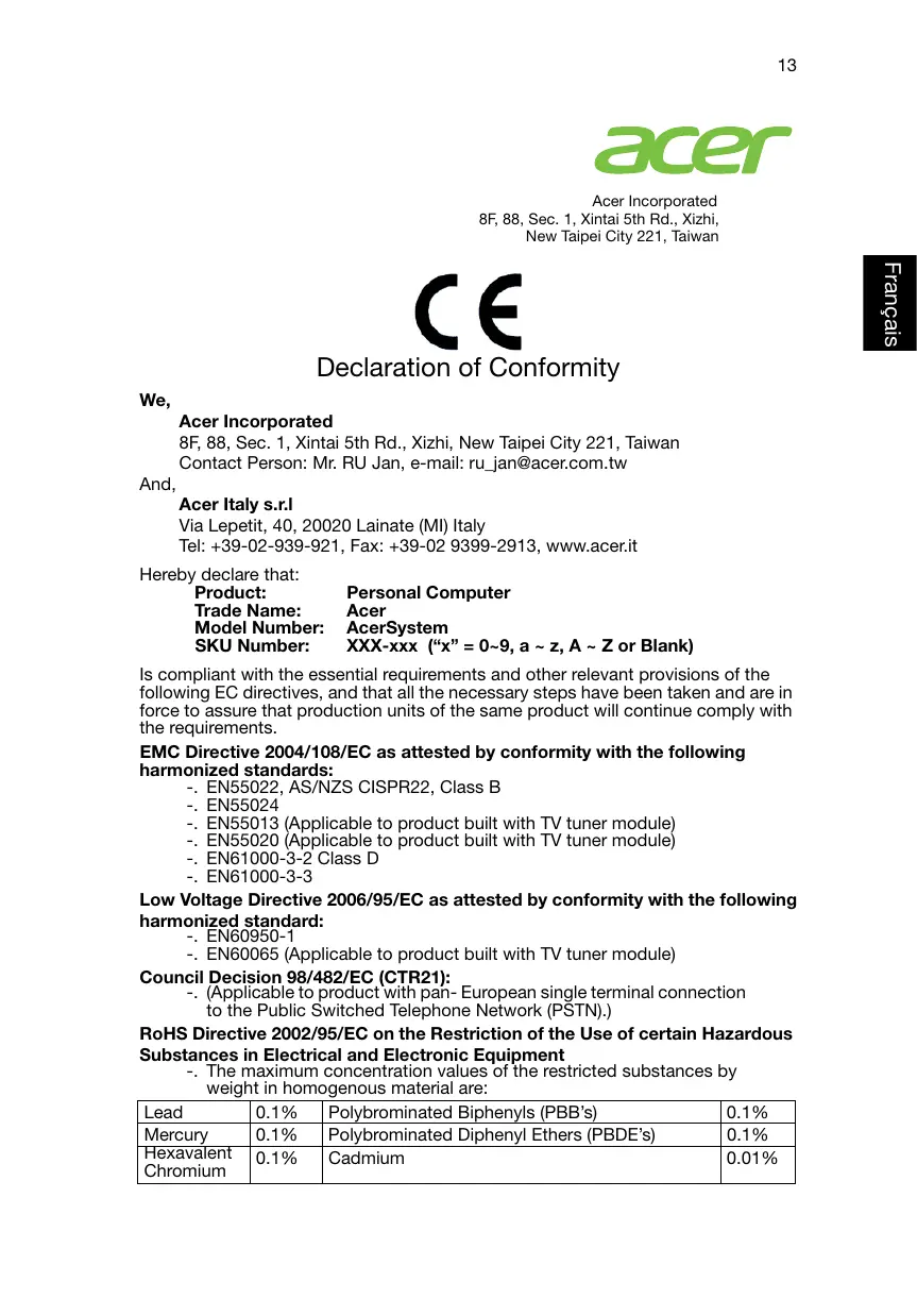 Acer Incorporated 8F, 88, Sec. 1, Xintai 5th Rd., Xizhi, New Taipei City 221, Taiwan Français Declaration of Conformity We, Acer Incorporated 8F, 88, Sec. 1, Xintai 5th Rd., Xizhi, New Taipei City 221, Taiwan Contact Person: Mr. RU Jan, e-mail: ru_jan@acer.com.tw And, Acer Italy s.r.l Via Lepetit, 40, 20020 Lainate (MI) Italy Tel: +39-02-939-921, Fax: +39-02 9399-2913, www.acer.it Hereby declare that: Product: Trade Name: Model Number: SKU Number: Personal Computer Acer AcerSystem XXX-xxx (“x” = 0~9, a ~ z, A ~ Z or Blank) Is compliant with the essential requirements and other relevant provisions of the following EC directives, and that all the necessary steps have been taken and are in force to assure that production units of the same product will continue comply with the requirements. EMC Directive 2004/108/EC as attested by conformity with the following harmonized standards: -. EN55022, AS/NZS CISPR22, Class B -. EN55024 -. EN55013 (Applicable to product built with TV tuner module) -. EN55020 (Applicable to product built with TV tuner module) -. EN61000-3-2 Class D -. EN61000-3-3 Low Voltage Directive 2006/95/EC as attested by conformity with the following harmonized standard: -. EN60950-1 -. EN60065 (Applicable to product built with TV tuner module) Council Decision 98/482/EC (CTR21): -. (Applicable to product with pan- European single terminal connection to the Public Switched Telephone Network (PSTN).) RoHS Directive 2002/95/EC on the Restriction of the Use of certain Hazardous Substances in Electrical and Electronic Equipment -. The maximum concentration values of the restricted substances by weight in homogenous material are: Lead 0.1% Polybrominated Biphenyls (PBB’s) 0.1% Mercury 0.1% Polybrominated Diphenyl Ethers (PBDE’s) 0.1% Hexavalent 0.1% Cadmium 0.01% Chromium
