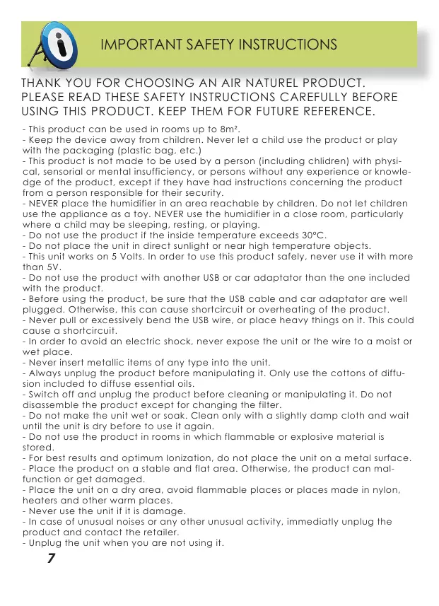 THANK YOU FOR CHOOSING AN AIR NATUREL PRODUCT. PLEASE READ THESE SAFETY INSTRUCTIONS CAREFULLY BEFORE USING THIS PRODUCT. KEEP THEM FOR FUTURE REFERENCE. - This product can be used in rooms up to 8m². - Keep the device away from children. Never let a child use the product or play with the packaging (plastic bag, etc.) - This product is not made to be used by a person (including chlidren) with physical, sensorial or mental insufficiency, or persons without any experience or knowledge of the product, except if they have had instructions concerning the product from a person responsible for their security. - NEVER place the humidifier in an area reachable by children. Do not let children use the appliance as a toy. NEVER use the humidifier in a close room, particularly where a child may be sleeping, resting, or playing. - Do not use the product if the inside temperature exceeds 30°C. - Do not place the unit in direct sunlight or near high temperature objects. - This unit works on 5 Volts. In order to use this product safely, never use it with more than 5V. - Do not use the product with another USB or car adaptator than the one included with the product. - Before using the product, be sure that the USB cable and car adaptator are well plugged. Otherwise, this can cause shortcircuit or overheating of the product. - Never pull or excessively bend the USB wire, or place heavy things on it. This could cause a shortcircuit. - In order to avoid an electric shock, never expose the unit or the wire to a moist or wet place. - Never insert metallic items of any type into the unit. - Always unplug the product before manipulating it. Only use the cottons of diffusion included to diffuse essential oils. - Switch off and unplug the product before cleaning or manipulating it. Do not disassemble the product except for changing the filter. - Do not make the unit wet or soak. Clean only with a slightly damp cloth and wait until the unit is dry before to use it again. - Do not use the product in rooms in which flammable or explosive material is stored. - For best results and optimum Ionization, do not place the unit on a metal surface. - Place the product on a stable and flat area. Otherwise, the product can malfunction or get damaged. - Place the unit on a dry area, avoid flammable places or places made in nylon, heaters and other warm places. - Never use the unit if it is damage. - In case of unusual noises or any other unusual activity, immediatly unplug the product and contact the retailer. - Unplug the unit when you are not using it.