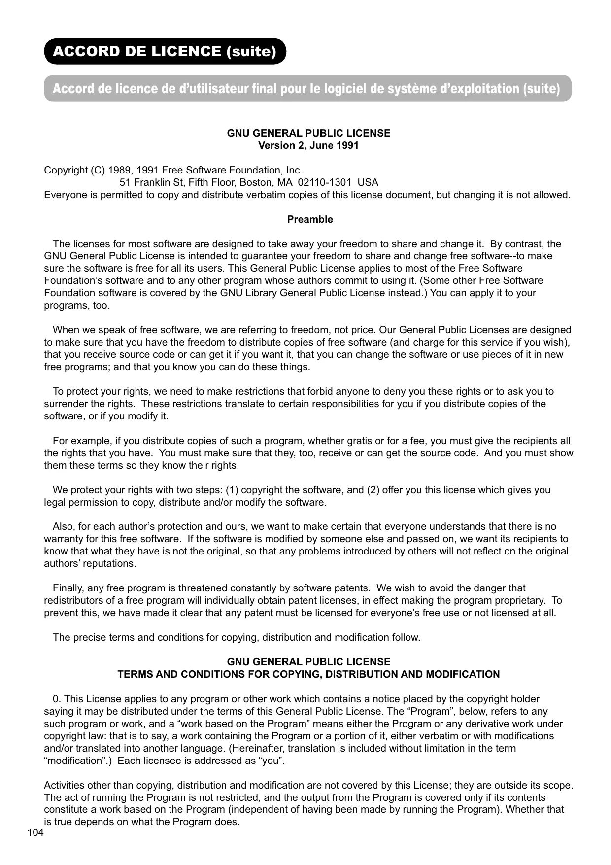 ACCORD DE LICENCE (suite) FRANÇAIS Accord de licence de d’utilisateur final pour le logiciel de système d’exploitation (suite) Each version is given a distinguishing version number. If the Program specifies a version number of this License which applies to it and “any later version”, you have the option of following the terms and conditions either of that version or of any later version published by the Free Software Foundation. If the Program does not specify a version number of this License, you may choose any version ever published by the Free Software Foundation.
