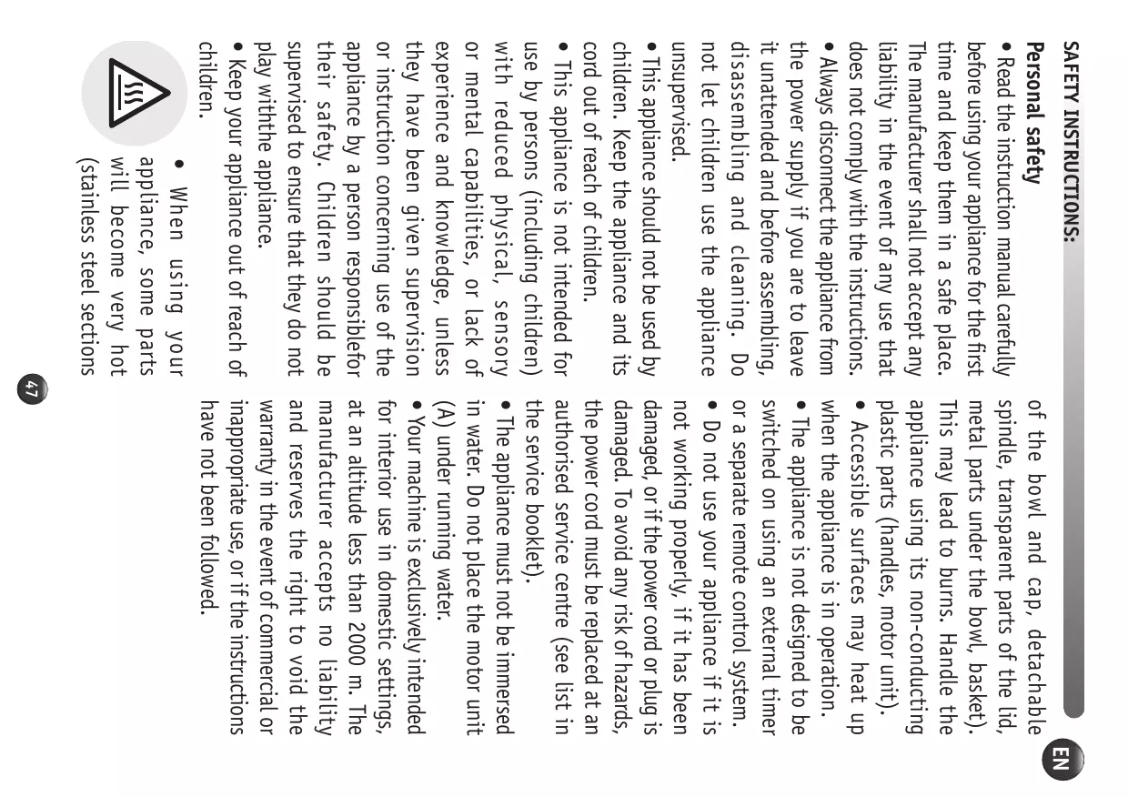 • Lisez attentivement le mode d’emploi avant la première utilisation de votre appareil et conservez-le : une utilisation non conforme au mode d’emploi dégagerait le fabricant de toute responsabilité. • Toujours déconnecter l’appareil de l’alimentation si on le laisse sans surveillance et avant montage, démontage ou nettoyage. Ne pas laisser les enfants utiliser l’appareil sans surveillance. • Cet appareil ne doit pas être utilisé par les enfants. Conserver l’appareil et son câble hors de portée des enfants. • Cet appareil n’est pas prévu pour être utilisé par des personnes (y compris les enfants) dont les capacités physiques, sensorielles ou mentales sont réduites ou des personnes dénuées d’experience ou de connaissance, sauf si elles ont pu bénéficier, par l’intermediaire d’une personne responsable de leur sécurité, d’une surveillance ou d’instructions préalables concernant l’utilisation de l’appareil. Il convient de surveiller les enfants pour s’assurer qu’ils ne jouent pas avec l’appareil. • Maintenez votre appareil hors de portée des enfants. • Lors de l’utilisation de l’appareil, certaines pièces atteignent des températures élevées 1