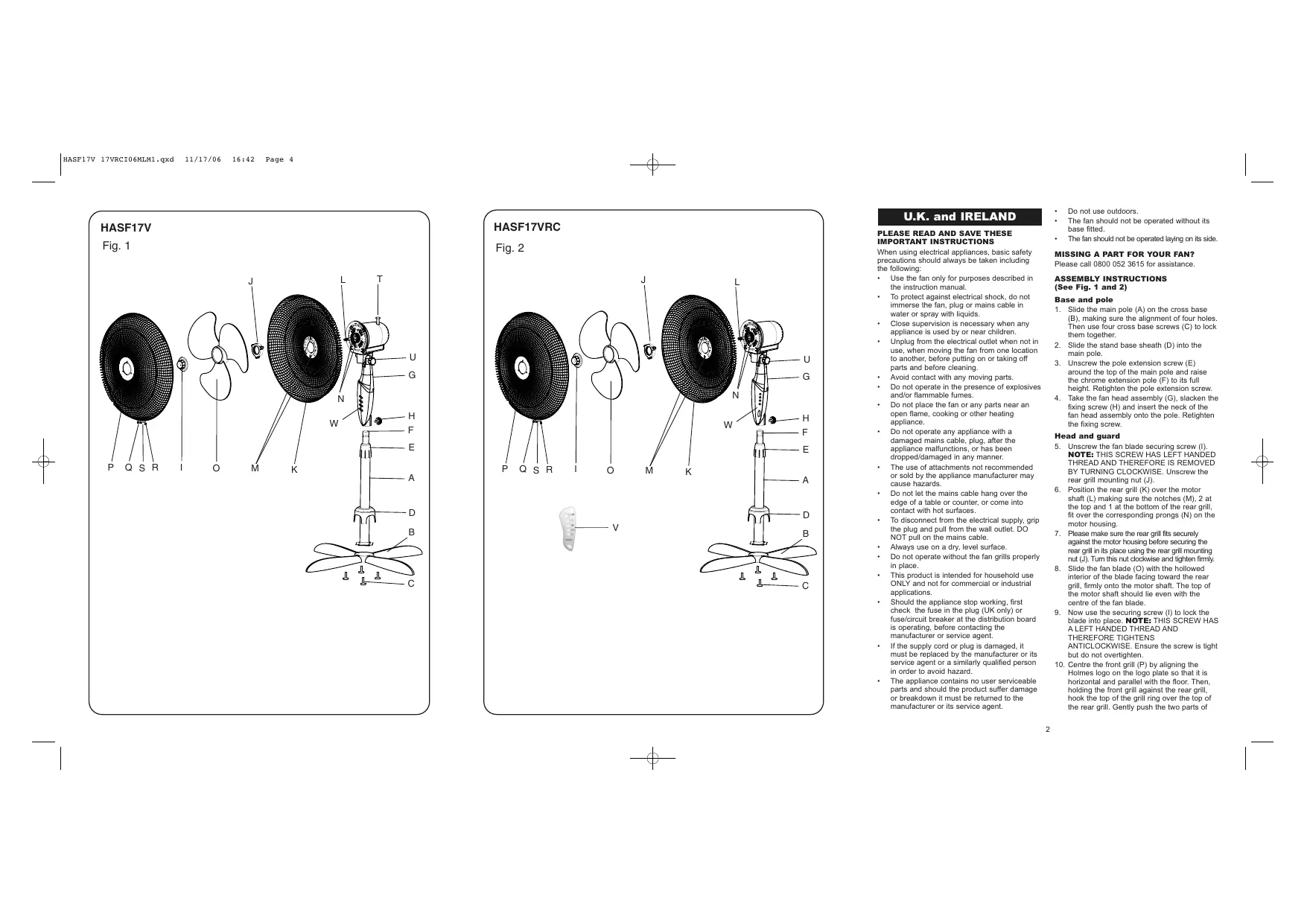 MISSING A PART FOR YOUR FAN? Please call 0800 052 3615 for assistance. ASSEMBLY INSTRUCTIONS (See Fig. 1 and 2) Base and pole 1. Slide the main pole (A) on the cross base (B), making sure the alignment of four holes. Then use four cross base screws (C) to lock them together. 2. Slide the stand base sheath (D) into the main pole. 3. Unscrew the pole extension screw (E) around the top of the main pole and raise the chrome extension pole (F) to its full height. Retighten the pole extension screw. 4. Take the fan head assembly (G), slacken the fixing screw (H) and insert the neck of the fan head assembly onto the pole. Retighten the fixing screw. Head and guard 5. Unscrew the fan blade securing screw (I). NOTE: THIS SCREW HAS LEFT HANDED THREAD AND THEREFORE IS REMOVED BY TURNING CLOCKWISE. Unscrew the rear grill mounting nut (J). 6. Position the rear grill (K) over the motor shaft (L) making sure the notches (M), 2 at the top and 1 at the bottom of the rear grill, fit over the corresponding prongs (N) on the motor housing. 7. Please make sure the rear grill fits securely against the motor housing before securing the rear grill in its place using the rear grill mounting nut (J). Turn this nut clockwise and tighten firmly. 8. Slide the fan blade (O) with the hollowed interior of the blade facing toward the rear grill, firmly onto the motor shaft. The top of the motor shaft should lie even with the centre of the fan blade. 9. Now use the securing screw (I) to lock the blade into place. NOTE: THIS SCREW HAS A LEFT HANDED THREAD AND THEREFORE TIGHTENS ANTICLOCKWISE. Ensure the screw is tight but do not overtighten. 10. Centre the front grill (P) by aligning the Holmes logo on the logo plate so that it is horizontal and parallel with the floor. Then, holding the front grill against the rear grill, hook the top of the grill ring over the top of the rear grill. Gently push the two parts of 2
