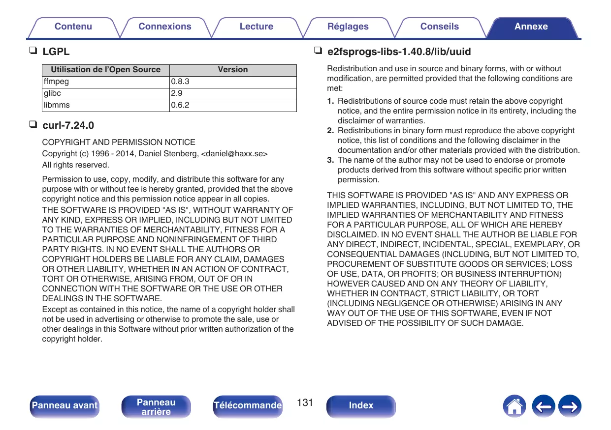 FLAC (Free Lossless Audio Codec) FLAC signifie Free lossless Audio Codec, et représente un format de fichier audio libre sans perte. Sans perte signifie que le son est compressé sans perte de qualité. La licence FLAC est indiquée ci-dessous. Copyright (C) 2000, 2001, 2002, 2003, 2004, 2005, 2006, 2007, 2008, 2009 Josh Coalson Redistribution and use in source and binary forms, with or without modification, are permitted provided that the following conditions are met: 0 Redistributions of source code must retain the above copyright notice, this list of conditions and the following disclaimer. 0 Redistributions in binary form must reproduce the above copyright notice, this list of conditions and the following disclaimer in the documentation and/or other materials provided with the distribution. 0 Neither the name of the Xiph.org Foundation nor the names of its contributors may be used to endorse or promote products derived from this software without specific prior written permission.