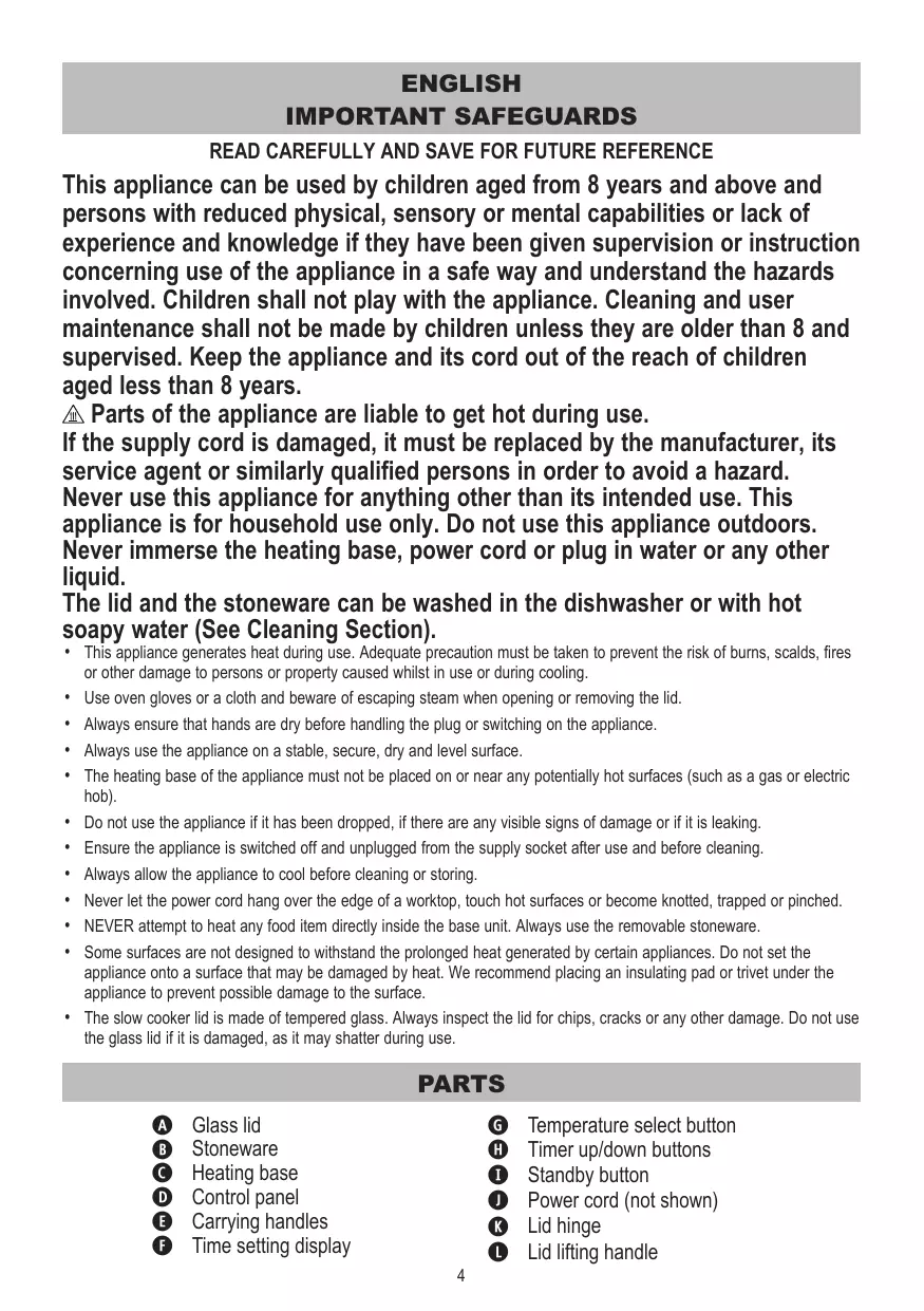 ENGLISH IMPORTANT SAFEGUARDS READ CAREFULLY AND SAVE FOR FUTURE REFERENCE This appliance can be used by children aged from 8 years and above and persons with reduced physical, sensory or mental capabilities or lack of experience and knowledge if they have been given supervision or instruction concerning use of the appliance in a safe way and understand the hazards involved. Children shall not play with the appliance. Cleaning and user maintenance shall not be made by children unless they are older than 8 and supervised. Keep the appliance and its cord out of the reach of children aged less than 8 years. Parts of the appliance are liable to get hot during use. If the supply cord is damaged, it must be replaced by the manufacturer, its service agent or similarly qualified persons in order to avoid a hazard. Never use this appliance for anything other than its intended use. This appliance is for household use only. Do not use this appliance outdoors. Never immerse the heating base, power cord or plug in water or any other liquid. The lid and the stoneware can be washed in the dishwasher or with hot soapy water (See Cleaning Section). • This appliance generates heat during use. Adequate precaution must be taken to prevent the risk of burns, scalds, fires • • • • • • • • • • •