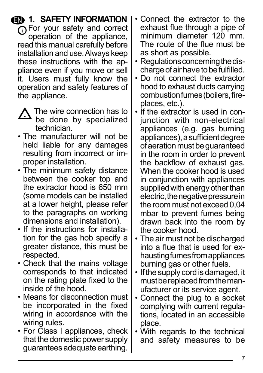 • Pour les appareils de Classe I, s’assurer que l’installation électrique de votre intérieur dispose d’une mise à la terre adéquate. Reliez l’aspirateur du conduit de cheminée avec un tube ayant un diamètre minimum de 120 mm. Le parcours des fumées doit être le plus court possible. Respecter toutes les normes concernant l’évacuation de l’air. Ne reliez pas la hotte aspirante aux conduits de cheminée qui acheminent les fumées de combustion (par ex. de chaudières, de cheminées, etc.). Si vous utilisez l’aspirateur en même temps que des appareils non électriques (par ex. fonctionnant au gaz), veillez à ce que la pièce soit adéquatement ventilée, afin d’empêcher le retour du flux des gaz d’évacuation. Si vous utilisez la hotte de cuisine en même temps que des appareils non alimentés à l’électricité, la pression négative dans la pièce ne doit pas dépasser 0,04 mbar, afin d’éviter que les fumées soient réaspirées dans la pièce où se trouve la hotte. Ne pas évacuer l’air à travers 15