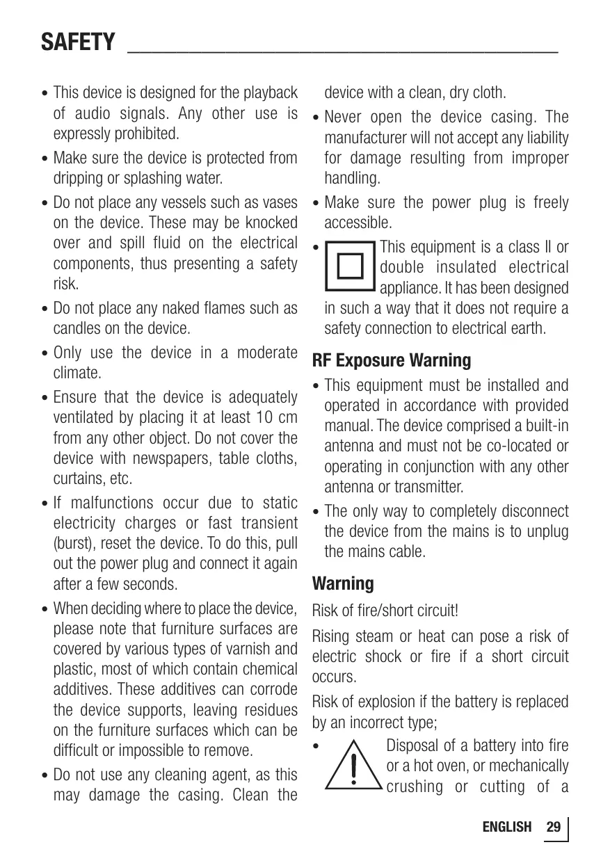 SAFETY____________________________________ This device is designed for the playback of audio signals. Any other use is expressly prohibited. • Make sure the device is protected from dripping or splashing water. • Do not place any vessels such as vases on the device. These may be knocked over and spill fluid on the electrical components, thus presenting a safety risk. • Do not place any naked flames such as candles on the device. • Only use the device in a moderate climate. • Ensure that the device is adequately ventilated by placing it at least 10 cm from any other object. Do not cover the device with newspapers, table cloths, curtains, etc. • If malfunctions occur due to static electricity charges or fast transient (burst), reset the device. To do this, pull out the power plug and connect it again after a few seconds. • When deciding where to place the device, please note that furniture surfaces are covered by various types of varnish and plastic, most of which contain chemical additives. These additives can corrode the device supports, leaving residues on the furniture surfaces which can be difficult or impossible to remove. • Do not use any cleaning agent, as this may damage the casing. Clean the •