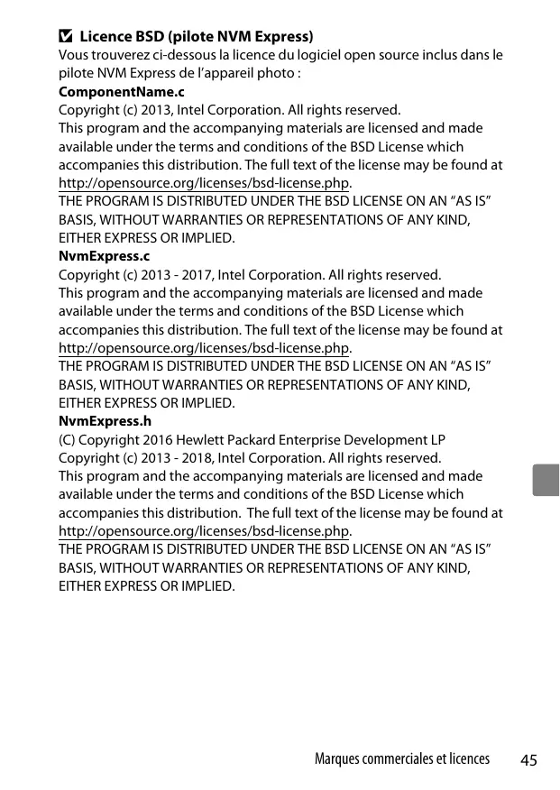 D Licence BSD (pilote NVM Express) Vous trouverez ci-dessous la licence du logiciel open source inclus dans le pilote NVM Express de l’appareil photo : ComponentName.c Copyright (c) 2013, Intel Corporation. All rights reserved. This program and the accompanying materials are licensed and made available under the terms and conditions of the BSD License which accompanies this distribution. The full text of the license may be found at http://opensource.org/licenses/bsd-license.php. THE PROGRAM IS DISTRIBUTED UNDER THE BSD LICENSE ON AN “AS IS” BASIS, WITHOUT WARRANTIES OR REPRESENTATIONS OF ANY KIND, EITHER EXPRESS OR IMPLIED. NvmExpress.c Copyright (c) 2013 - 2017, Intel Corporation. All rights reserved. This program and the accompanying materials are licensed and made available under the terms and conditions of the BSD License which accompanies this distribution. The full text of the license may be found at http://opensource.org/licenses/bsd-license.php. THE PROGRAM IS DISTRIBUTED UNDER THE BSD LICENSE ON AN “AS IS” BASIS, WITHOUT WARRANTIES OR REPRESENTATIONS OF ANY KIND, EITHER EXPRESS OR IMPLIED. NvmExpress.h (C) Copyright 2016 Hewlett Packard Enterprise Development LP Copyright (c) 2013 - 2018, Intel Corporation. All rights reserved. This program and the accompanying materials are licensed and made available under the terms and conditions of the BSD License which accompanies this distribution. The full text of the license may be found at http://opensource.org/licenses/bsd-license.php. THE PROGRAM IS DISTRIBUTED UNDER THE BSD LICENSE ON AN “AS IS” BASIS, WITHOUT WARRANTIES OR REPRESENTATIONS OF ANY KIND, EITHER EXPRESS OR IMPLIED.