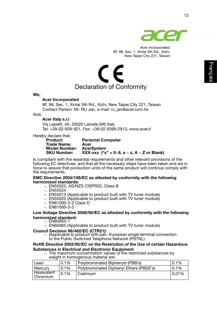 Is compliant with the essential requirements and other relevant provisions of the following EC directives, and that all the necessary steps have been taken and are in force to assure that production units of the same product will continue comply with the requirements. EMC Directive 2004/108/EC as attested by conformity with the following harmonized standards: -. EN55022, AS/NZS CISPR22, Class B -. EN55024 -. EN55013 (Applicable to product built with TV tuner module) -. EN55020 (Applicable to product built with TV tuner module) -. EN61000-3-2 Class D -. EN61000-3-3 Low Voltage Directive 2006/95/EC as attested by conformity with the following harmonized standard: -. EN60950-1 -. EN60065 (Applicable to product built with TV tuner module) Council Decision 98/482/EC (CTR21): -. (Applicable to product with pan- European single terminal connection to the Public Switched Telephone Network (PSTN).) RoHS Directive 2002/95/EC on the Restriction of the Use of certain Hazardous Substances in Electrical and Electronic Equipment -. The maximum concentration values of the restricted substances by weight in homogenous material are: Lead 0.1% Polybrominated Biphenyls (PBB’s) 0.1% Mercury 0.1% Polybrominated Diphenyl Ethers (PBDE’s) 0.1% Hexavalent 0.1% Cadmium 0.01% Chromium