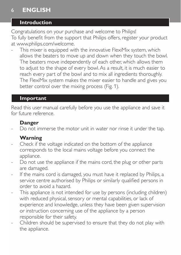 - Vous pouvez appuyer sur le bouton Turbo pour mélanger plus rapidement ou pour augmenter la vitesse pendant les opérations plus difficiles, par exemple lors du pétrissage de la pâte. - Si vous souhaitez interrompre l’opération quelque temps, réglez le variateur de vitesse sur 0, placez ensuite le batteur (avec les fouets, les crochets ou l’accessoire pour purée fixés) sur son talon jusqu’à ce que vous repreniez l’opération. 7 Lorsque vous avez fini, réglez le variateur de vitesse sur 0 et débranchez l’appareil. 8 Pour retirer les fouets, les crochets ou l’accessoire pour purée, poussez le variateur de vitesse vers l’avant en position d’éjection (fig. 6). Nettoyage Débranchez toujours l’appareil avant de le nettoyer. Ne plongez jamais le bloc moteur dans l’eau et ne le rincez pas sous le robinet. 1 Nettoyez les fouets, les crochets et l’accessoire pour purée à l’eau chaude savonneuse ou au lave-vaisselle.