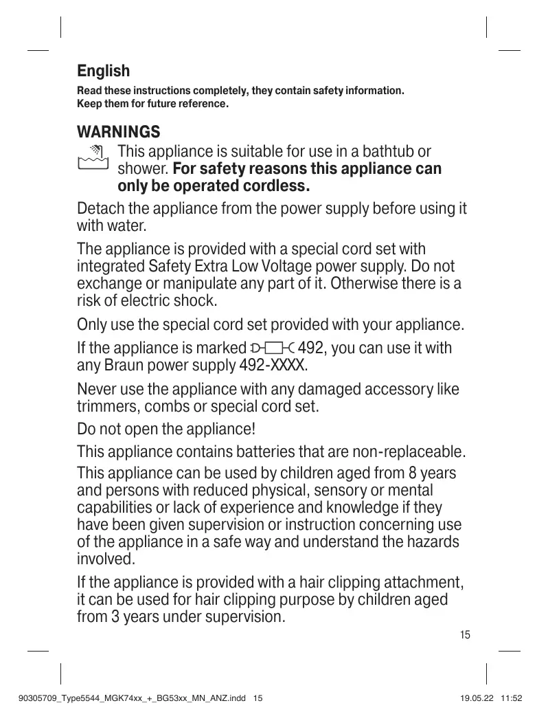 English Read these instructions completely, they contain safety information. Keep them for future reference. WARNINGS This appliance is suitable for use in a bathtub or shower. For safety reasons this appliance can only be operated cordless. Detach the appliance from the power supply before using it with water. The appliance is provided with a special cord set with integrated Safety Extra Low Voltage power supply. Do not exchange or manipulate any part of it. Otherwise there is a risk of electric shock. Only use the special cord set provided with your appliance. If the appliance is marked 492, you can use it with any Braun power supply 492-XXXX. Never use the appliance with any damaged accessory like trimmers, combs or special cord set. Do not open the appliance! This appliance contains batteries that are non-replaceable. This appliance can be used by children aged from 8 years and persons with reduced physical, sensory or mental capabilities or lack of experience and knowledge if they have been given supervision or instruction concerning use of the appliance in a safe way and understand the hazards involved. If the appliance is provided with a hair clipping attachment, it can be used for hair clipping purpose by children aged from 3 years under supervision.