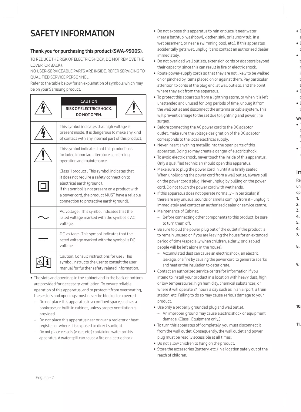 USER MANUAL SWA-9500S SAFETY INFORMATION Thank you for purchasing this product (SWA-9500S). TO REDUCE THE RISK OF ELECTRIC SHOCK, DO NOT REMOVE THE COVER (OR BACK). NO USER-SERVICEABLE PARTS ARE INSIDE. REFER SERVICING TO QUALIFIED SERVICE PERSONNEL. Refer to the table below for an explanation of symbols which may be on your Samsung product. CAUTION RISK OF ELECTRIC SHOCK. DO NOT OPEN. This symbol indicates that high voltage is present inside. It is dangerous to make any kind of contact with any internal part of this product. This symbol indicates that this product has included important literature concerning operation and maintenance. Class II product : This symbol indicates that it does not require a safety connection to electrical earth (ground). If this symbol is not present on a product with a power cord, the product MUST have a reliable connection to protective earth (ground). AC voltage : This symbol indicates that the rated voltage marked with the symbol is AC voltage. DC voltage : This symbol indicates that the rated voltage marked with the symbol is DC voltage. Caution, Consult instructions for use : This symbol instructs the user to consult the user manual for further safety related information. •• The slots and openings in the cabinet and in the back or bottom are provided for necessary ventilation. To ensure reliable operation of this apparatus, and to protect it from overheating, these slots and openings must never be blocked or covered. –– Do not place this apparatus in a confined space, such as a bookcase, or built-in cabinet, unless proper ventilation is provided. –– Do not place this apparatus near or over a radiator or heat register, or where it is exposed to direct sunlight. –– Do not place vessels (vases etc.) containing water on this apparatus. A water spill can cause a fire or electric shock.