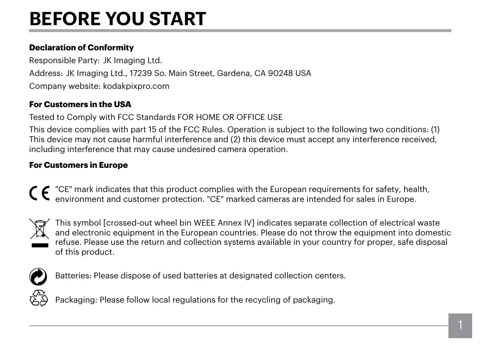 BEFORE YOU START Declaration of Conformity Responsible Party: JK Imaging Ltd. Address: JK Imaging Ltd., 17239 So. Main Street, Gardena, CA 90248 USA Company website: kodakpixpro.com For Customers in the USA Tested to Comply with FCC Standards FOR HOME OR OFFICE USE This device complies with part 15 of the FCC Rules. Operation is subject to the following two conditions: (1) This device may not cause harmful interference and (2) this device must accept any interference received, including interference that may cause undesired camera operation. For Customers in Europe "CE" mark indicates that this product complies with the European requirements for safety, health, environment and customer protection. "CE" marked cameras are intended for sales in Europe. This symbol [crossed-out wheel bin WEEE Annex IV] indicates separate collection of electrical waste and electronic equipment in the European countries. Please do not throw the equipment into domestic refuse. Please use the return and collection systems available in your country for proper, safe disposal of this product. Batteries: Please dispose of used batteries at designated collection centers. Packaging: Please follow local regulations for the recycling of packaging.