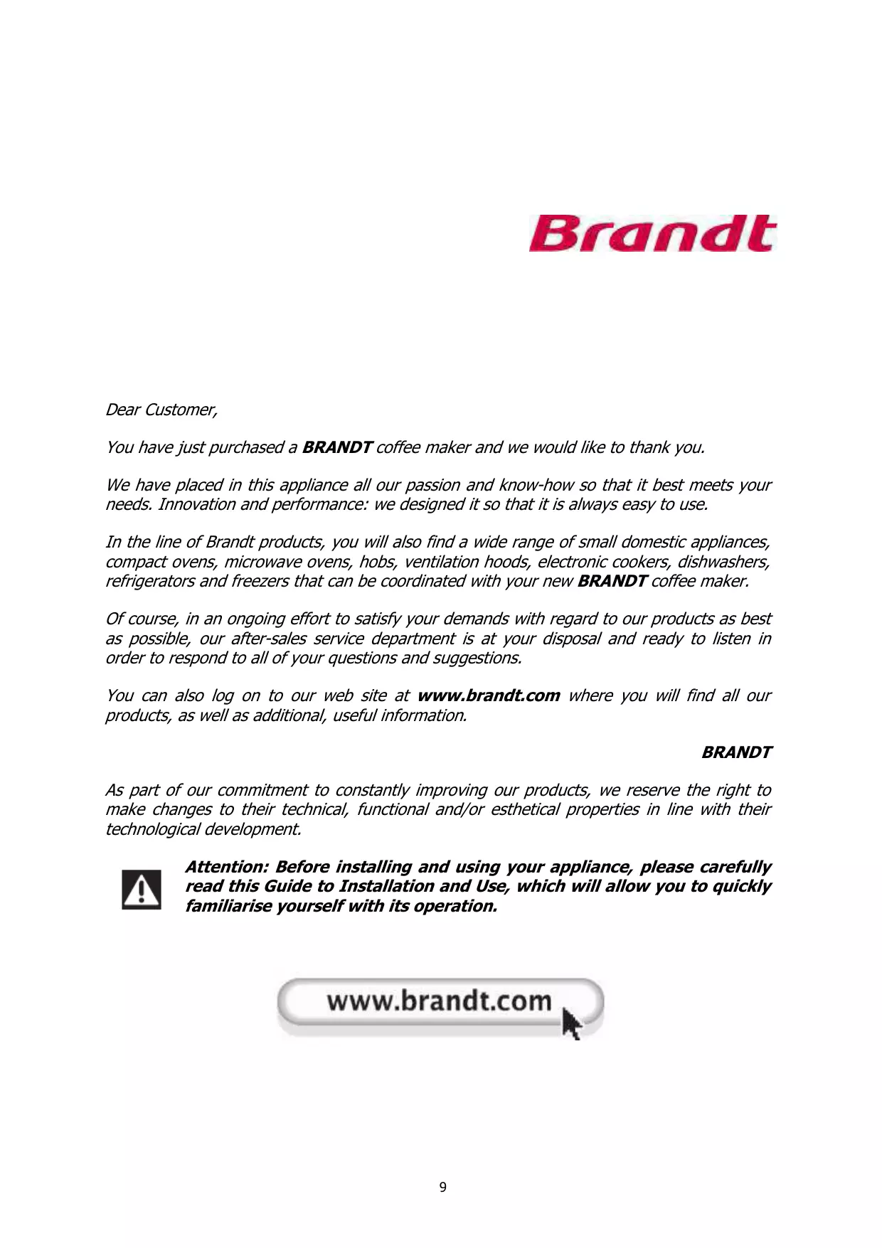 You have just purchased a BRANDT coffee maker and we would like to thank you.
