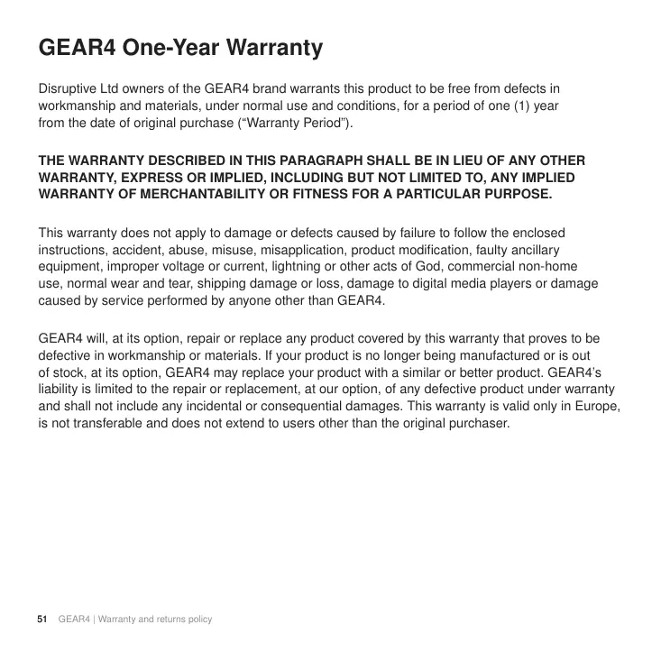 GEAR4 One-Year Warranty Disruptive Ltd owners of the GEAR4 brand warrants this product to be free from defects in workmanship and materials, under normal use and conditions, for a period of one (1) year from the date of original purchase (“Warranty Period”). THE WARRANTY DESCRIBED IN THIS PARAGRAPH SHALL BE IN LIEU OF ANY OTHER WARRANTY, EXPRESS OR IMPLIED, INCLUDING BUT NOT LIMITED TO, ANY IMPLIED WARRANTY OF MERCHANTABILITY OR FITNESS FOR A PARTICULAR PURPOSE. This warranty does not apply to damage or defects caused by failure to follow the enclosed instructions, accident, abuse, misuse, misapplication, product modification, faulty ancillary equipment, improper voltage or current, lightning or other acts of God, commercial non-home use, normal wear and tear, shipping damage or loss, damage to digital media players or damage caused by service performed by anyone other than GEAR4. GEAR4 will, at its option, repair or replace any product covered by this warranty that proves to be defective in workmanship or materials. If your product is no longer being manufactured or is out of stock, at its option, GEAR4 may replace your product with a similar or better product. GEAR4’s liability is limited to the repair or replacement, at our option, of any defective product under warranty and shall not include any incidental or consequential damages. This warranty is valid only in Europe, is not transferable and does not extend to users other than the original purchaser.