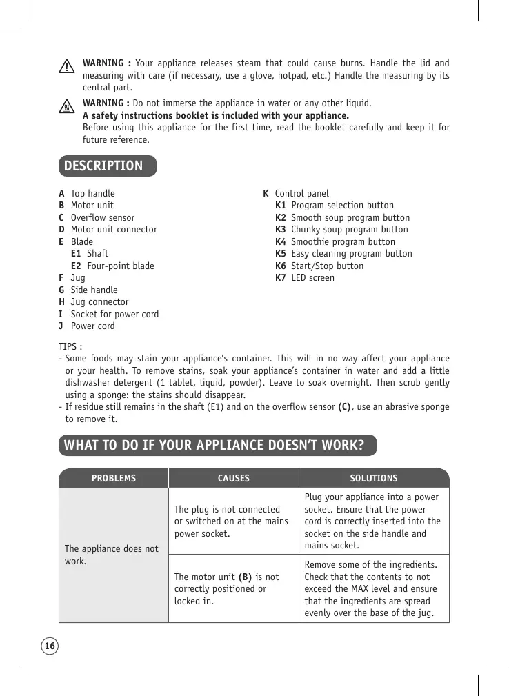 DESCRIPTION A B C D E F G H I J K Control panel K1 Program selection button K2 Smooth soup program button K3 Chunky soup program button K4 Smoothie program button K5 Easy cleaning program button K6 Start/Stop button K7 LED screen
