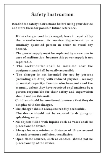 USER MANUAL Safety Instruction Read these safety instructions before using your device and store them for possible future reference. · If the charger cord is damaged, have it repaired by the manufacturer, its service department or a similarly qualified person in order to avoid any hazard. · The power supply must be replaced by a new one in case of malfunction, because this power supply is not repairable. · The socket-outlet shall be installed near the equipment and shall be easily accessible · The charger is not intended for use by persons (including children) with reduced physical, sensory or mental capacity. Persons who have not read the manual, unless they have received explanations by a person responsible for their safety and supervision should not use this unit. ·Children should be monitored to ensure that they do not play with the charger. ·The charger should always be readily accessible. · The device should not be exposed to dripping or splashing water. · No objects filled with liquids such as vases shall be placed on the device. · Always leave a minimum distance of 10 cm around the unit to ensure sufficient ventilation. · Open flame sources, such as candles, should not be placed on top of the device.