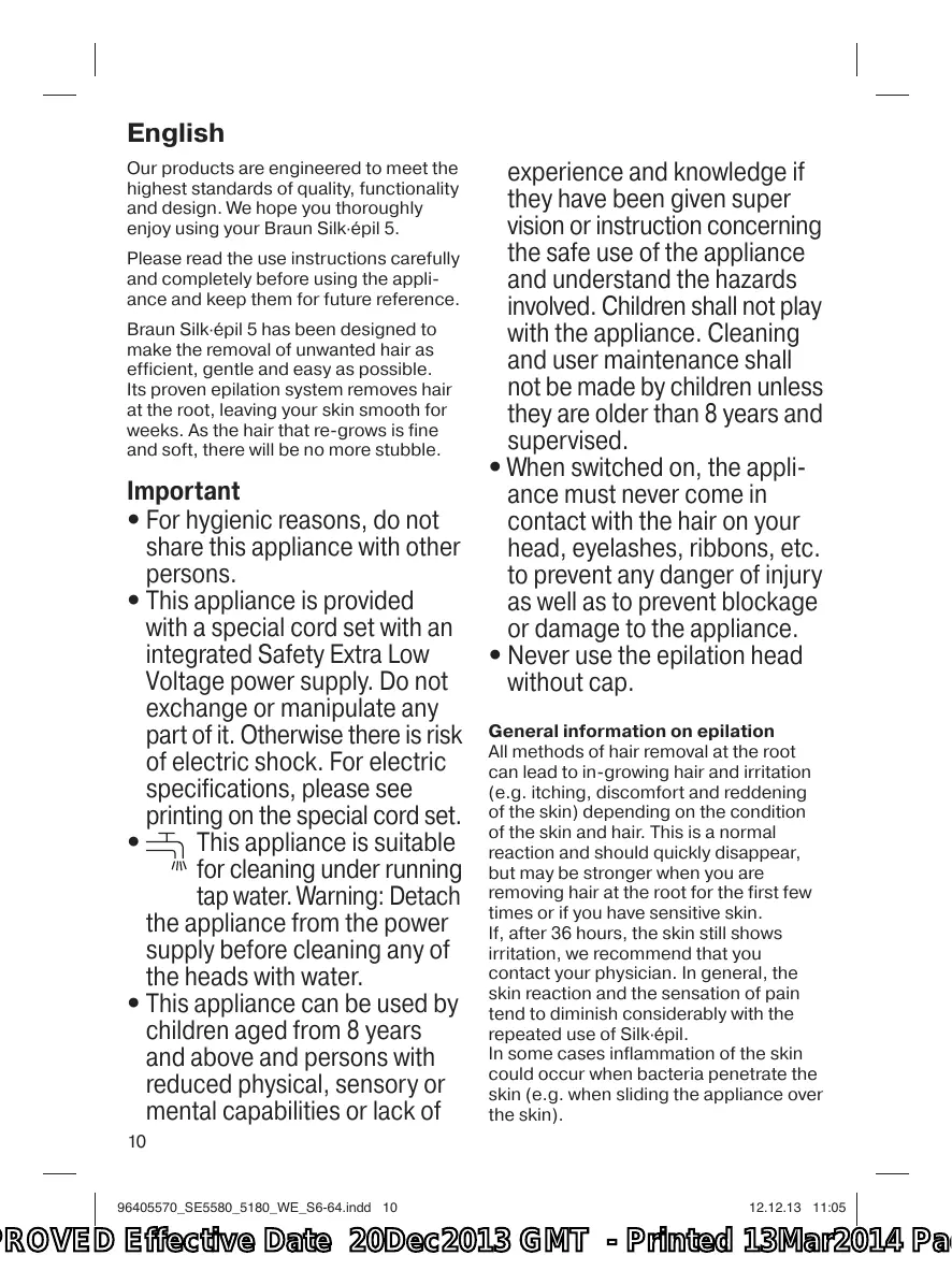 English Our products are engineered to meet the highest standards of quality, functionality and design. We hope you thoroughly enjoy using your Braun Silk·épil 5. Please read the use instructions carefully and completely before using the appliance and keep them for future reference. Braun Silk·épil 5 has been designed to make the removal of unwanted hair as efficient, gentle and easy as possible. Its proven epilation system removes hair at the root, leaving your skin smooth for weeks. As the hair that re-grows is fine and soft, there will be no more stubble.