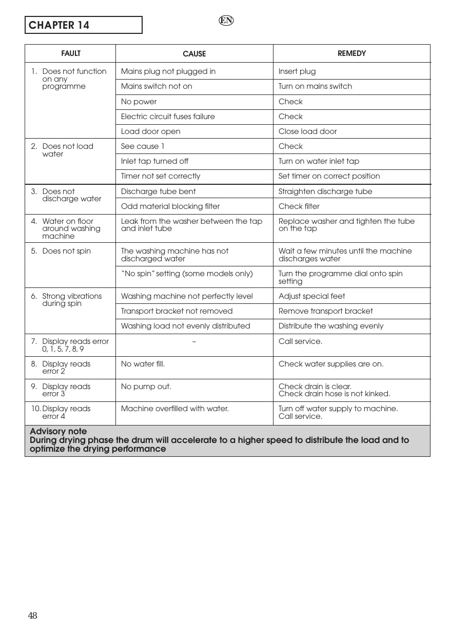 | 9. Display reads error 3 | No pump out. | Check drain is clear. Check drain hose is not kinked. |