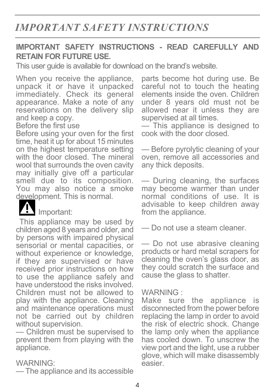 IMPORTANT SAFETY INSTRUCTIONS - READ CAREFULLY AND RETAIN FOR FUTURE USE. This user guide is available for download on the brand’s website. parts become hot during use. Be careful not to touch the heating elements inside the oven. Children under 8 years old must not be allowed near it unless they are supervised at all times. — This appliance is designed to cook with the door closed. When you receive the appliance, unpack it or have it unpacked immediately. Check its general appearance. Make a note of any reservations on the delivery slip and keep a copy. Before the first use Before using your oven for the first time, heat it up for about 15 minutes on the highest temperature setting with the door closed. The mineral wool that surrounds the oven cavity may initially give off a particular smell due to its composition. You may also notice a smoke development. This is normal. — Before pyrolytic cleaning of your oven, remove all accessories and any thick deposits. — During cleaning, the surfaces may become warmer than under normal conditions of use. It is advisable to keep children away from the appliance. Important: This appliance may be used by children aged 8 years and older, and by persons with impaired physical sensorial or mental capacities, or without experience or knowledge, if they are supervised or have received prior instructions on how to use the appliance safely and have understood the risks involved. Children must not be allowed to play with the appliance. Cleaning and maintenance operations must not be carried out by children without supervision. — Children must be supervised to prevent them from playing with the appliance. — Do not use a steam cleaner. — Do not use abrasive cleaning products or hard metal scrapers for cleaning the oven’s glass door, as they could scratch the surface and cause the glass to shatter.