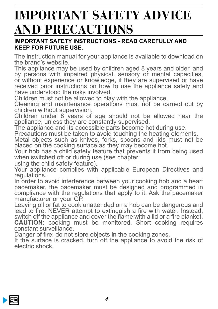 Réglage de la puissance12 Horizone ou duozone 12 Réglage de la minuterie12 Minuteur indépendant 13 Touche ELAPSED TIME13 Verrouillage des commandes 13 Fonction ICS14 Cet appareil peut être utilisé par des enfants âgés de 8 ans et plus et par des personnes ayant des capacités physiques, sensorielles ou mentales réduites ou des personnes sans expérience et connaissance, si elles ont été correctement informées ou formées à l’utilisation de l’appareil en toute sécurité et qu’elles en comprennent les risques qui en résultent. Les enfants ne doivent pas jouer avec l’appareil. Le nettoyage et l’entretien par l’usager ne doivent pas être effectués par des enfants sans surveillance. Les enfants de moins de 8 ans doivent être tenus à l’écart à moins qu’ils ne soient surveillés en permanence. L’appareil et ses parties accessibles deviennent chauds pendant l’utilisation. Des précautions doivent être prises pour éviter de toucher les éléments chauffants. Les objets métalliques tels que couteaux, fourchettes, cuillères et couvercles ne doivent pas être placés sur la surface, car ils peuvent devenir chauds. Votre table possède une sécurité enfant qui verrouille son utilisation à l’arrêt ou en cours de cuisson (voir chapitre: utilisation de la sécurité enfant). Votre appareil est conforme aux directives et réglementations européennes auxquelles il est soumis. Afin qu’il n’y ait pas d’interférences entre votre table de cuisson et un stimulateur cardiaque, ce dernier doit être conçu et réglé en conformité avec la réglementation qui le concerne. Renseignez vous auprès de son fabricant ou votre médecin traitant. Une cuisson avec de l’huile ou de la matière grasse effectuée sur une table, et sans surveillance peut être dangereuse et donner lieu à un incendie. Ne tentez JAMAIS d’éteindre un feu avec de l’eau, mais coupez l’alimentation de l’appareil avant de couvrir la flamme avec par exemple un couvercle ou une couverture anti feu. ATTENTION : la cuisson doit être surveillée. Une cuisson courte nécessite une surveillance continue. Risque d’incendie : ne pas stocker d’objets sur les zones de cuisson. Si la surface est fissurée, déconnecter l’appareil pour éviter le risque de choc électrique. 4