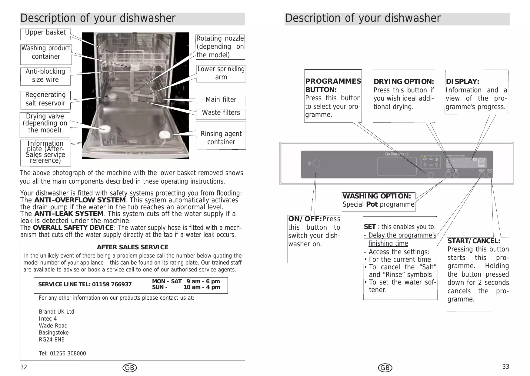 The above photograph of the machine with the lower basket removed shows you all the main components described in these operating instructions. Your dishwasher is fitted with safety systems protecting you from flooding: The ANTI-OVERFLOW SYSTEM. This system automatically activates the drain pump if the water in the tub reaches an abnormal level. The ANTI-LEAK SYSTEM. This system cuts off the water supply if a leak is detected under the machine. The OVERALL SAFETY DEVICE: The water supply hose is fitted with a mechanism that cuts off the water supply directly at the tap if a water leak occurs. AFTER SALES SERVICE In the unlikely event of there being a problem please call the number below quoting the model number of your appliance – this can be found on its rating plate. Our trained staff are available to advise or book a service call to one of our authorised service agents. SERVICE LINE TEL: 01159 766937