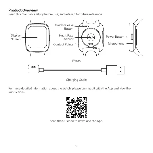 • Lorsque vous utilisez la montre pour mesurer votre fréquence cardiaque, tâchez de garder le poignet immobile. • Le bracelet a une résistance à l’eau de 5 ATM. Vous pouvez le porter à la piscine ou en mer, à proximité du rivage. Cependant, elle ne peut être utilisée ni dans les endroits à forte température et/ou humidité, tels que les sources chaudes, les saunas et la douche, ni au cours d’activités en eau vive ou profonde, telles que le plongeon, la plongée sous-marine et le surf. En outre, rappelez-vous d’enlever la montre lorsque vous faites la lessive. • L’écran tactile de la montre ne peut pas être utilisé sous l’eau. Si la montre entre en contact avec de l’eau, utilisez un chiffon doux pour essuyer l’excès d’eau de sa surface avant de l’utiliser. • Lors de l’utilisation quotidienne, évitez de porter la montre trop serrée. Gardez la surface de contact sèche et nettoyez régulièrement le bracelet à l’eau. Cessez immédiatement d’utiliser la montre et consultez un médecin si la peau en contact avec la montre présente des signes de rougeur ou de gonflement. • Pendant la charge, gardez l’adaptateur secteur, le chargeur et la montre dans un environnement sec. Ne les touchez pas avec des mains humides, et ne les exposez pas à la pluie ou à d’autres liquides. • Si vous ne prévoyez pas d’utiliser la montre pendant une période prolongée, chargez-la entièrement, débranchez-la, puis entreposez-la dans un endroit frais et sec. Rechargez la montre au moins une fois tous les 3 mois. • La plage de température de fonctionnement de la montre est comprise entre -10° C et 45° C. Si la température ambiante est trop élevée ou trop basse, la montre risque de mal fonctionner. • Si l'écran est cassé, ne le touchez pas et n'essayez pas de l'enlever. Au lieu de cela, vous devez cesser immédiatement d'utiliser la montre et contacter un fournisseur de services agréé. • Utilisez le chargeur inclus pour recharger la montre. Utilisez uniquement les adaptateurs secteur conformes aux normes de sécurité locales, ou certifiés et fournis par des fabricants habilités. • Ne démontez pas, ne cognez pas et ne pressez pas la montre, et ne la jetez pas au feu. Cessez toute utilisation de la batterie en cas de gonflement ou de fuite. • La montre possède une batterie intégrée. Pour éviter d’abîmer la batterie ou la montre, veuillez ne pas démonter et remplacer la batterie vous-même. Seuls des prestataires de services agréés sont habilités 15