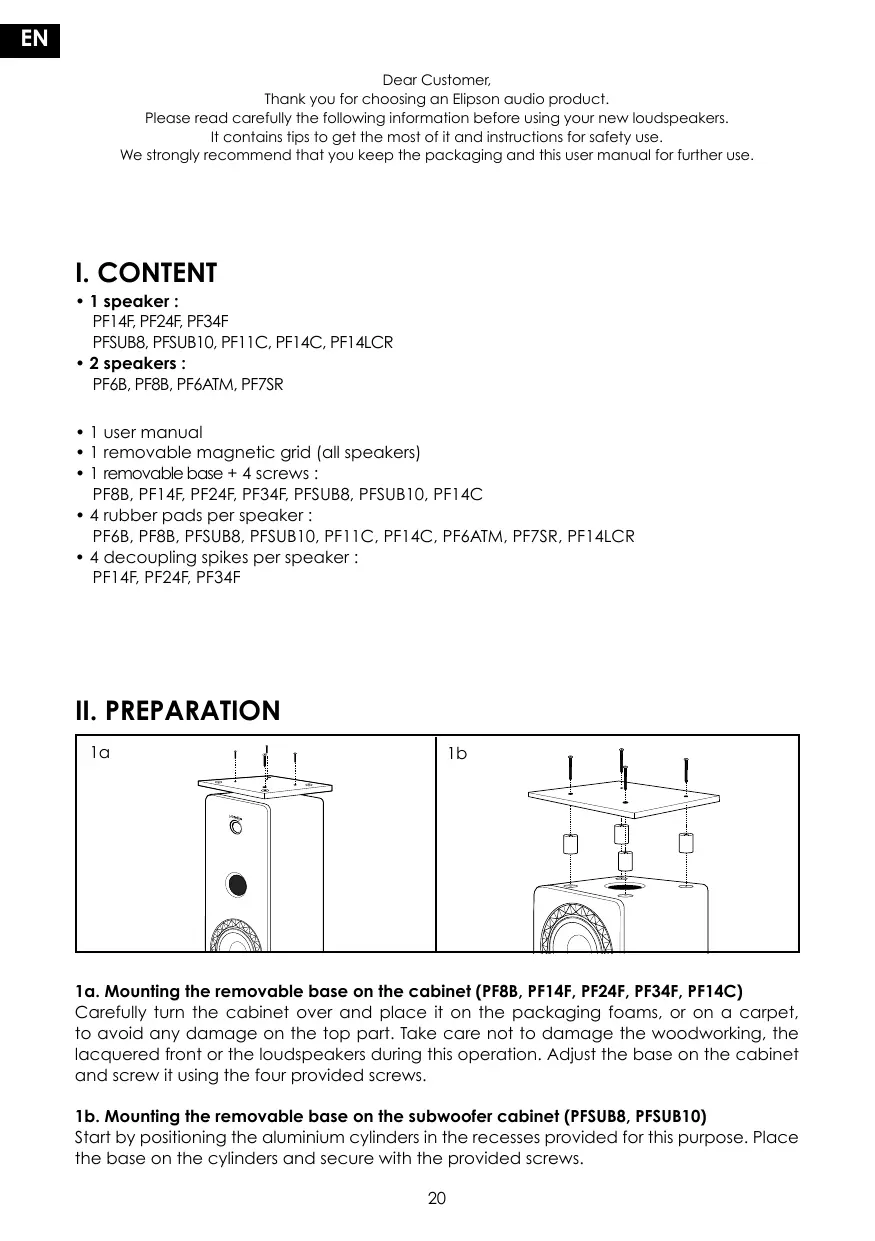 I. CONTENT • 1 speaker : PF14F, PF24F, PF34F PFSUB8, PFSUB10, PF11C, PF14C, PF14LCR • 2 speakers : PF6B, PF8B, PF6ATM, PF7SR • 1 user manual • 1 removable magnetic grid (all speakers) • 1 removable base + 4 screws : PF8B, PF14F, PF24F, PF34F, PFSUB8, PFSUB10, PF14C • 4 rubber pads per speaker : PF6B, PF8B, PFSUB8, PFSUB10, PF11C, PF14C, PF6ATM, PF7SR, PF14LCR • 4 decoupling spikes per speaker :