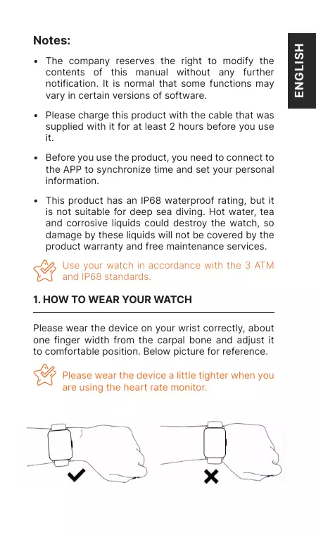 • Avant d’utiliser le produit, vous devez vous connecter à l’application pour synchroniser l’heure et définir vos informations personnelles. • Ce produit présente un indice d’étanchéité IP68, mais ne convient pas à la plongée en haute mer. L’eau chaude, le thé et tout autre liquide corrosif peuvent endommager la montre. Par conséquent, tout dommage causé par ces liquides ne sera pas couvert par la garantie produit et les services de réparation gratuits. Utilisez votre montre suivant les normes 3 ATM et IP68.