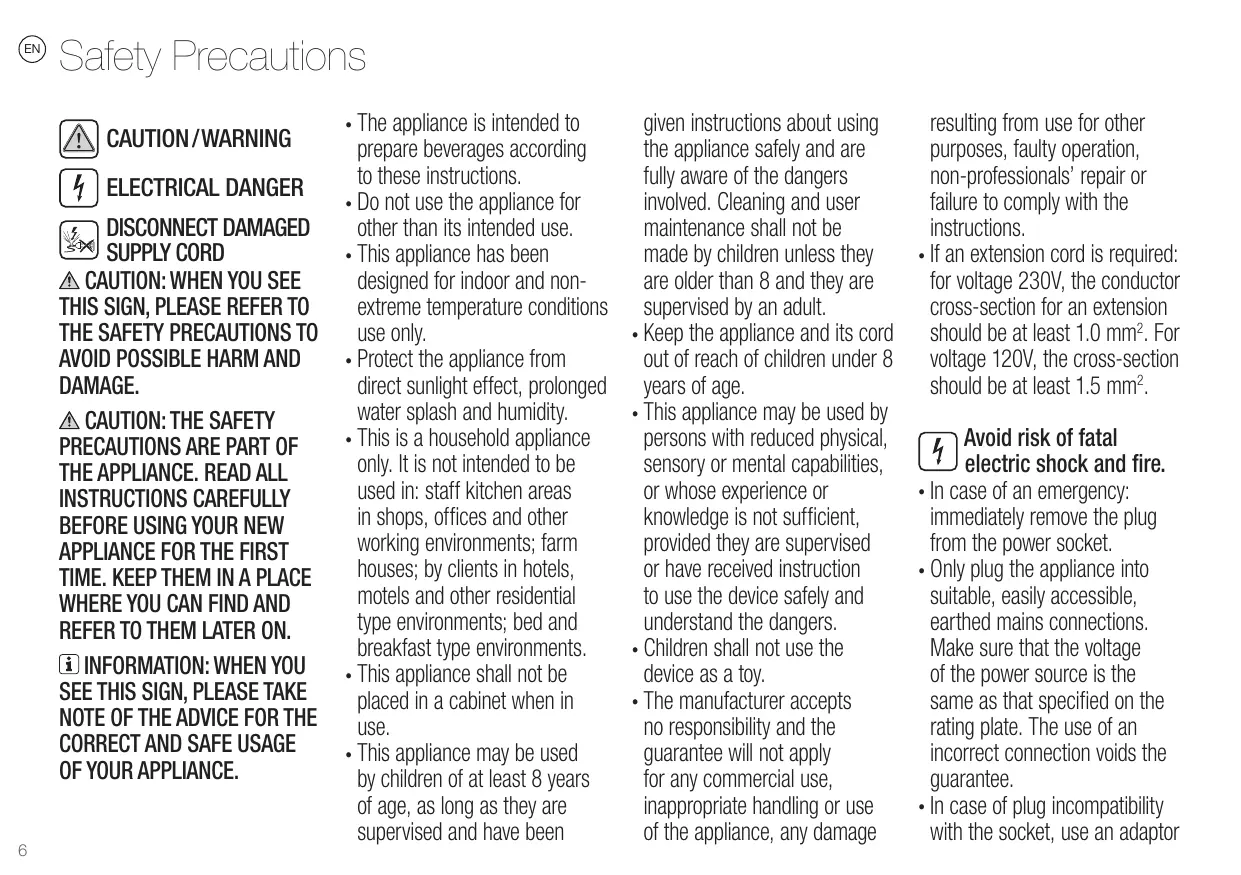 The appliance is intended to prepare beverages according to these instructions. • Do not use the appliance for other than its intended use. • This appliance has been designed for indoor and nonextreme temperature conditions use only. • Protect the appliance from direct sunlight effect, prolonged water splash and humidity. • This is a household appliance only. It is not intended to be used in: staff kitchen areas in shops, offices and other working environments; farm houses; by clients in hotels, motels and other residential type environments; bed and breakfast type environments. • This appliance shall not be placed in a cabinet when in use. • This appliance may be used by children of at least 8 years of age, as long as they are supervised and have been •