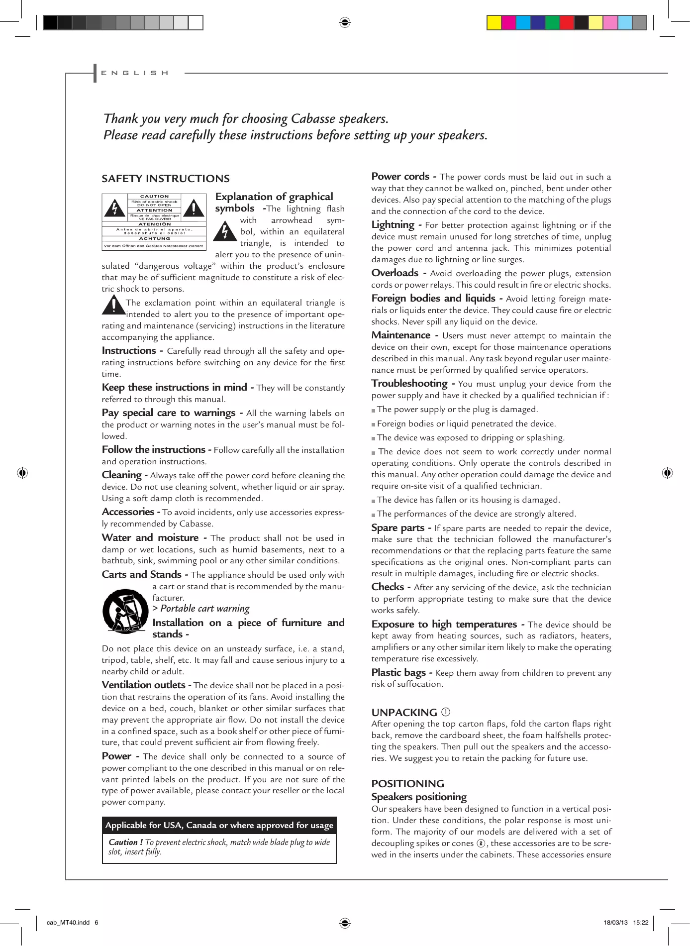 Étant donné l’évolution des techniques mises en oeuvre pour une fiabilité accrue et une recherche constante de qualité optimale, Cabasse se réserve le droit d’apporter toutes modifications aux modèles présentés sur les fiches techniques ou les documents publicitaires. cab_MT40.indd 5 18/03/13 15:22 english Thank you very much for choosing Cabasse speakers. Please read carefully these instructions before setting up your speakers. SAFETY INSTRUCTIONS Explanation of graphical symbols -The lightning flash with arrowhead symbol, within an equilateral triangle, is intended to alert you to the presence of uninsulated “dangerous voltage” within the product’s enclosure that may be of sufficient magnitude to constitute a risk of electric shock to persons. The exclamation point within an equilateral triangle is intended to alert you to the presence of important operating and maintenance (servicing) instructions in the literature accompanying the appliance. Instructions - Carefully read through all the safety and operating instructions before switching on any device for the first time. Keep these instructions in mind - They will be constantly referred to through this manual. Lightning - For better protection against lightning or if the device must remain unused for long stretches of time, unplug the power cord and antenna jack. This minimizes potential damages due to lightning or line surges. Overloads - Avoid overloading the power plugs, extension cords or power relays. This could result in fire or electric shocks. Foreign bodies and liquids - Avoid letting foreign materials or liquids enter the device. They could cause fire or electric shocks. Never spill any liquid on the device. Maintenance - Users must never attempt to maintain the device on their own, except for those maintenance operations described in this manual. Any task beyond regular user maintenance must be performed by qualified service operators. Troubleshooting - You must unplug your device from the power supply and have it checked by a qualified technician if : Pay special care to warnings - All the warning labels on The power supply or the plug is damaged. the product or warning notes in the user’s manual must be followed. The device was exposed to dripping or splashing. Follow the instructions - Follow carefully all the installation and operation instructions. Cleaning - Always take off the power cord before cleaning the device. Do not use cleaning solvent, whether liquid or air spray. Using a soft damp cloth is recommended. Accessories - To avoid incidents, only use accessories expressly recommended by Cabasse. Water and moisture - The product shall not be used in damp or wet locations, such as humid basements, next to a bathtub, sink, swimming pool or any other similar conditions. Carts and Stands - The appliance should be used only with a cart or stand that is recommended by the manufacturer. > Portable cart warning Installation on a piece of furniture and stands - Do not place this device on an unsteady surface, i.e. a stand, tripod, table, shelf, etc. It may fall and cause serious injury to a nearby child or adult. Ventilation outlets - The device shall not be placed in a position that restrains the operation of its fans. Avoid installing the device on a bed, couch, blanket or other similar surfaces that may prevent the appropriate air flow. Do not install the device in a confined space, such as a book shelf or other piece of furniture, that could prevent sufficient air from flowing freely. Power - The device shall only be connected to a source of power compliant to the one described in this manual or on relevant printed labels on the product. If you are not sure of the type of power available, please contact your reseller or the local power company. Applicable for USA, Canada or where approved for usage Caution ! To prevent electric shock, match wide blade plug to wide slot, insert fully. cab_MT40.indd 6 Power cords - The power cords must be laid out in such a way that they cannot be walked on, pinched, bent under other devices. Also pay special attention to the matching of the plugs and the connection of the cord to the device. Foreign bodies or liquid penetrated the device. The device does not seem to work correctly under normal operating conditions. Only operate the controls described in this manual. Any other operation could damage the device and require on-site visit of a qualified technician. The device has fallen or its housing is damaged. The performances of the device are strongly altered. Spare parts - If spare parts are needed to repair the device, make sure that the technician followed the manufacturer’s recommendations or that the replacing parts feature the same specifications as the original ones. Non-compliant parts can result in multiple damages, including fire or electric shocks. Checks - After any servicing of the device, ask the technician to perform appropriate testing to make sure that the device works safely. Exposure to high temperatures - The device should be kept away from heating sources, such as radiators, heaters, amplifiers or any other similar item likely to make the operating temperature rise excessively. Plastic bags - Keep them away from children to prevent any risk of suffocation. UNPACKING 1 After opening the top carton flaps, fold the carton flaps right back, remove the cardboard sheet, the foam halfshells protecting the speakers. Then pull out the speakers and the accessories. We suggest you to retain the packing for future use. POSITIONING Speakers positioning Our speakers have been designed to function in a vertical position. Under these conditions, the polar response is most uniform. The majority of our models are delivered with a set of decoupling spikes or cones 2, these accessories are to be screwed in the inserts under the cabinets. These accessories ensure 18/03/13 15:22 the stability of the speaker while limiting resonance coming from certain types of grou