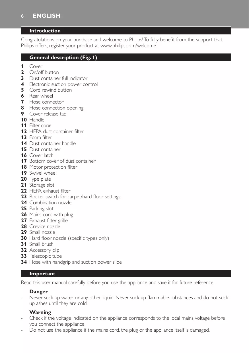 Raccord du flexible Orifice de raccordement du flexible Languette de déverrouillage du couvercle Poignée Cône du filtre Filtre HEPA du compartiment à poussière Filtre en mousse Poignée du compartiment à poussière Compartiment à poussière Loquet du couvercle Couvercle inférieur du compartiment à poussière Filtre de protection du moteur Roulette pivotante Plaque signalétique Insert pour rangement du tube Filtre sortie HEPA Sélecteur pour moquettes/sols durs Brosse standard Insert pour rangement du tube Cordon d’alimentation avec fiche secteur Grille du filtre sortie Suceur plat Petite brosse Brosse pour sols durs (certains modèles uniquement) -- Si le cordon d’alimentation est endommagé, il doit être remplacé par Philips, par un Centre Service Agréé Philips ou par un technicien qualifié afin d’éviter tout accident. -- Cet appareil n’est pas destiné à être utilisé par des personnes (notamment des enfants) dont les capacités physiques, sensorielles ou intellectuelles sont réduites, ou par des personnes manquant d’expérience ou de connaissances, à moins que celles-ci ne soient sous surveillance ou qu’elles n’aient reçu des instructions quant à l’utilisation de l’appareil par une personne responsable de leur sécurité. -- Veillez à ce que les enfants ne puissent pas jouer avec l’appareil. -- Ne dirigez pas le flexible, le tube ou tout autre accessoire vers les yeux ou les oreilles et ne les placez pas dans votre bouche lorsqu’ils sont raccordés à l’aspirateur et que celui-ci est sous tension. Attention -- N’aspirez pas d’objets de grande taille car ils peuvent bloquer le passage de l’air dans le tube ou le tuyau. -- Lorsque vous aspirez des cendres, du sable fin, de la chaux, de la poussière de ciment ou d’autres substances similaires, les pores des filtres du compartiment à poussière et du filtre de protection du moteur peuvent se boucher. Si vous constatez une forte diminution de la puissance d’aspiration, nettoyez les filtres du compartiment à poussière et le filtre de protection du moteur. -- Débranchez toujours l’appareil avant de vider le compartiment à poussière ou de nettoyer les filtres. -- N’utilisez jamais l’appareil sans le filtre de protection du moteur. Vous risqueriez d’endommager le moteur et de réduire la durée de vie de l’appareil. -- Utilisez exclusivement le cône du filtre Philips fourni avec l’appareil. -- Niveau sonore : Lc = 82 dB(A). Champs électromagnétiques (CEM) Cet appareil Philips est conforme à toutes les normes relatives aux champs électromagnétiques (CEM). Il répond aux règles de sécurité établies sur la base des connaissances scientifiques actuelles s’il est manipulé correctement et conformément aux instructions de ce mode d’emploi. Avant l’utilisation Tuyau 1 Pour raccorder le tuyau, insérez-le dans l’appareil (vous devez entendre un clic) (fig. 2). 2 Pour débrancher le tuyau, appuyez sur les boutons de déverrouillage (1) et tirez le raccord du flexible hors de son orifice de raccordement (2). (fig. 3) Tube télescopique 1 Pour fixer le tube à la poignée du tuyau, insérez l’extrémité fine dans la partie plus large en tournant légèrement (fig. 4). -- Pour détacher le tube, tirez dessus en le tournant légèrement. 2 Réglez le tube télescopique à la longueur qui vous convient. Faites glisser le bouton coulissant du tube, puis poussez la partie inférieure du tube vers le bas ou tirez-la vers le haut (fig. 5). Brosse standard La brosse standard permet de nettoyer les moquettes (sans brossettes) ou les sols durs (avec brossettes).
