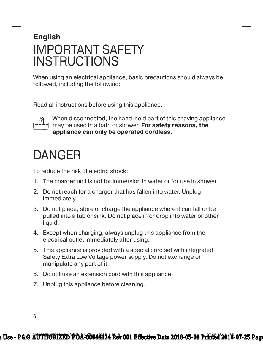 DANGER To reduce the risk of electric shock: 1. The charger unit is not for immersion in water or for use in shower. 2. Do not reach for a charger that has fallen into water. Unplug immediately. 3. Do not place, store or charge the appliance where it can fall or be pulled into a tub or sink. Do not place in or drop into water or other liquid. 4. Except when charging, always unplug this appliance from the electrical outlet immediately after using. 5. This appliance is provided with a special cord set with integrated Safety Extra Low Voltage power supply. Do not exchange or manipulate any part of it. 6. Do not use an extension cord with this appliance. 7. Unplug this appliance before cleaning.
