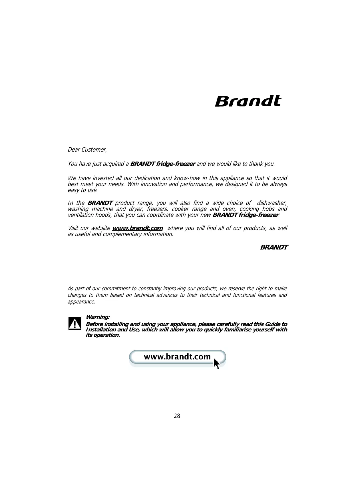 Dear Customer, You have just acquired a BRANDT fridge-freezer and we would like to thank you. We have invested all our dedication and know-how in this appliance so that it would best meet your needs. With innovation and performance, we designed it to be always easy to use. In the BRANDT product range, you will also find a wide choice of dishwasher, washing machine and dryer, freezers, cooker range and oven, cooking hobs and ventilation hoods, that you can coordinate with your new BRANDT fridge-freezer. Visit our website www.brandt.com where you will find all of our products, as well as useful and complementary information. BRANDT As part of our commitment to constantly improving our products, we reserve the right to make changes to them based on technical advances to their technical and functional features and appearance.