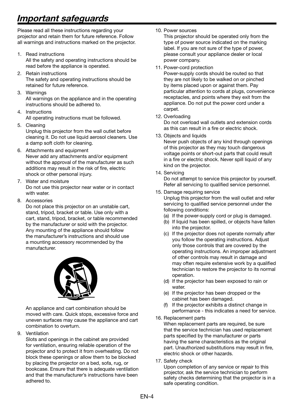 1. Read instructions All the safety and operating instructions should be read before the appliance is operated. 2. Retain instructions The safety and operating instructions should be retained for future reference. 3. Warnings All warnings on the appliance and in the operating instructions should be adhered to. 4. Instructions All operating instructions must be followed. 5. Cleaning Unplug this projector from the wall outlet before cleaning it. Do not use liquid aerosol cleaners. Use a damp soft cloth for cleaning. 6. Attachments and equipment Never add any attachments and/or equipment without the approval of the manufacturer as such additions may result in the risk of fire, electric shock or other personal injury. 7. Water and moisture Do not use this projector near water or in contact with water. 8. Accessories Do not place this projector on an unstable cart, stand, tripod, bracket or table. Use only with a cart, stand, tripod, bracket, or table recommended by the manufacturer or sold with the projector. Any mounting of the appliance should follow the manufacturer’s instructions and should use a mounting accessory recommended by the manufacturer.