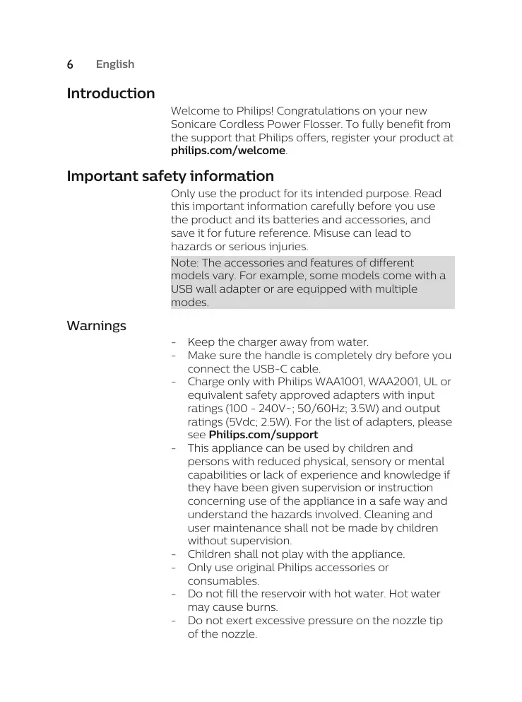 Keep the charger away from water. Make sure the handle is completely dry before you connect the USB-C cable. Charge only with Philips WAA1001, WAA2001, UL or equivalent safety approved adapters with input ratings (100 - 240V~; 50/60Hz; 3.5W) and output ratings (5Vdc; 2.5W). For the list of adapters, please see Philips.com/support This appliance can be used by children and persons with reduced physical, sensory or mental capabilities or lack of experience and knowledge if they have been given supervision or instruction concerning use of the appliance in a safe way and understand the hazards involved. Cleaning and user maintenance shall not be made by children without supervision. Children shall not play with the appliance. Only use original Philips accessories or consumables. Do not fill the reservoir with hot water. Hot water may cause burns. Do not exert excessive pressure on the nozzle tip of the nozzle.